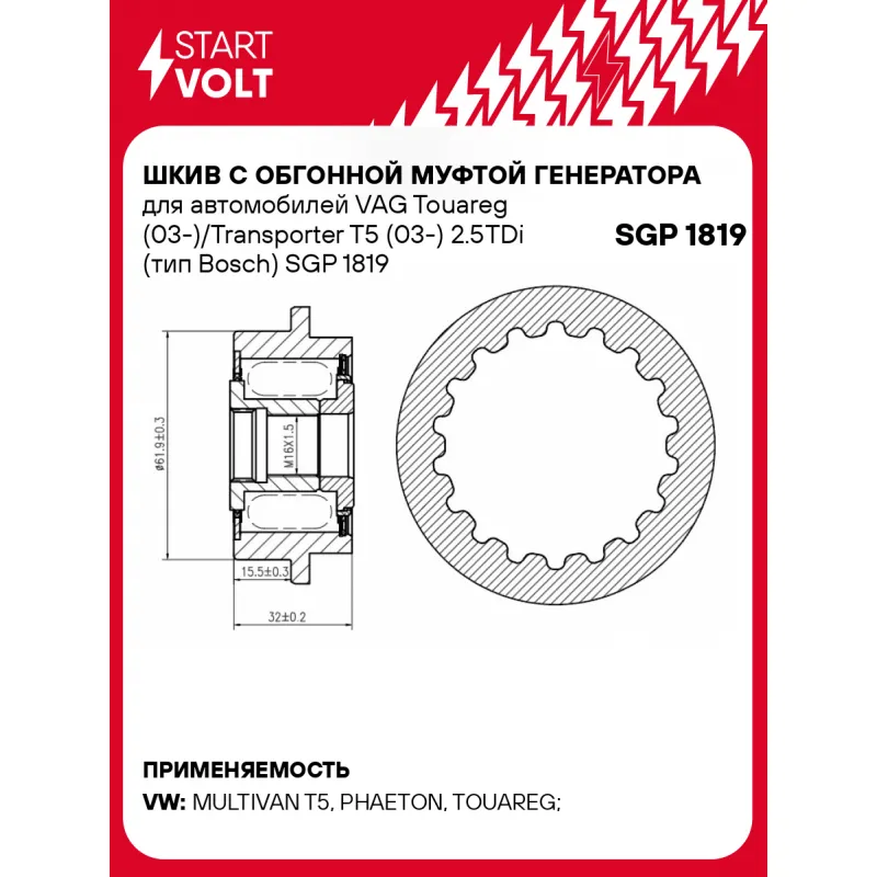 Шкив с обгонной муфтой генератора для автомобилей VAG Touareg (03-)/Transporter T5 (03-) 2.5TDi (тип Bosch) Характеристики: Артикул: SGP 1819 OEM номера: 070 903 327 C, 070 903 327 D, 535 0186 10 Длина, мм: 33,6 Внутренний диаметр, мм: 17 Наружный диаметр, мм: 62 Вылет шкива, мм: 17 Внутренняя резьба: M16x1,5 Количество на автомобиль: 1 Гарантия: от 1 года.