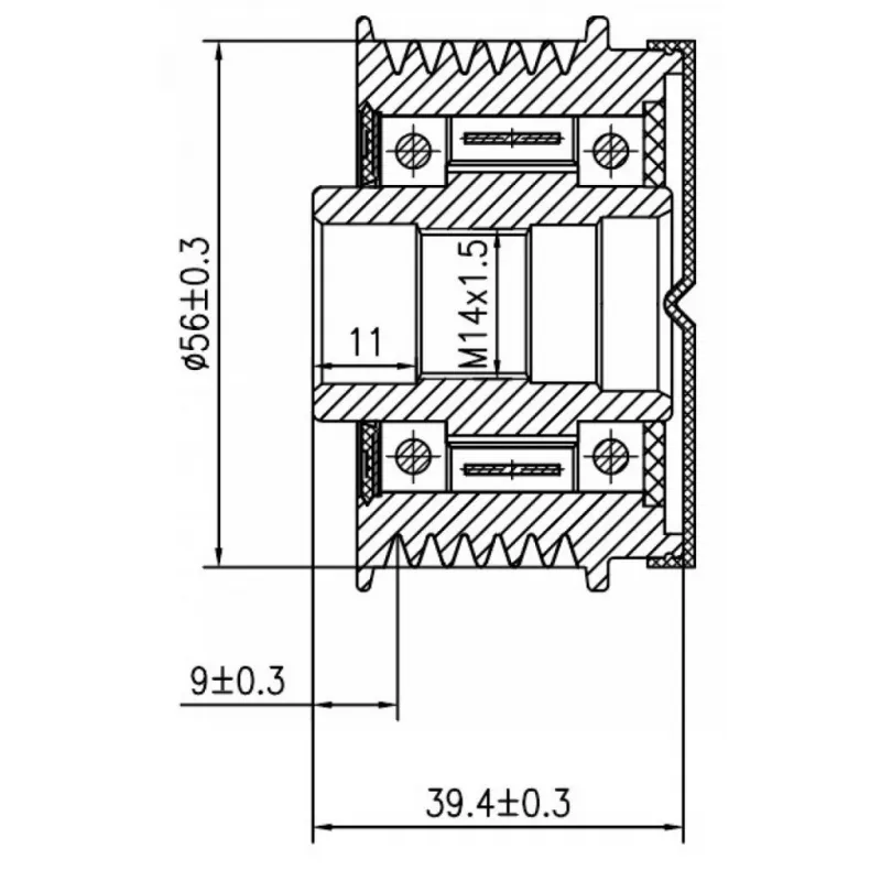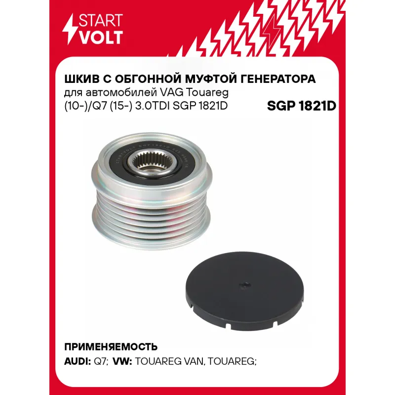 Шкив с обгонной муфтой генератора для автомобилей VAG Touareg (10-)/Q7 (15-) 3.0TDI Характеристики: Артикул: SGP 1821D OEM номера: 059903024B, 059903024BX, 59903024B, 59903024BX, 535 0340 10, EG21S012, 439978 Длина, мм: 39,4 Внутренний диаметр, мм: 17 Наружный диаметр, мм: 56 Количество ручьев: 6 Вылет шкива, мм: 9 Внутренняя резьба: M14x1,5 Количество на автомобиль: 1 Гарантия: от 1 года.