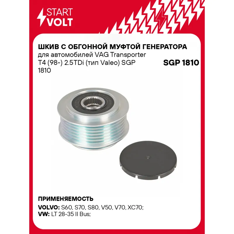 Шкив с обгонной муфтой генератора для автомобилей VAG Transporter T4 (98-) 2.5TDi (тип Valeo) Характеристики: Артикул: SGP 1810 OEM номера: 8658644, 021 903 119 K, 021 903 119 H, 535 0052 10 Длина, мм: 40,1 Внутренний диаметр, мм: 17 Наружный диаметр, мм: 67,83 Количество ручьев: 6 Вылет шкива, мм: 14,5 Внутренняя резьба: M16x1,... Читать полностью →