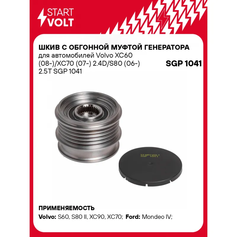 Шкив с обгонной муфтой генератора для автомобилей Volvo XC60 (08-)/XC70 (07-) 2.4D/S80 (06-) 2.5T Характеристики: Артикул: SGP 1041 OEM номера: 30667682, 535 0121 10 Длина, мм: 40,8 Внутренний диаметр, мм: 17 Наружный диаметр, мм: 54 Количество ручьев: 5 Вылет шкива, мм: 17,95 Внутренняя резьба: M16x1,5 Количество на автомобиль: 1 Подходит для авто: Volvo S60 (00-), S80 II (06-), XC90 (02-), XC70 (07-) Ford Mondeo IV (07-) Для проверки применяемости отправьте VIN автомобиля через вкладку "Есть вопросы о товаре?" Гарантия: от 1 года.