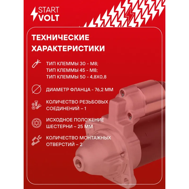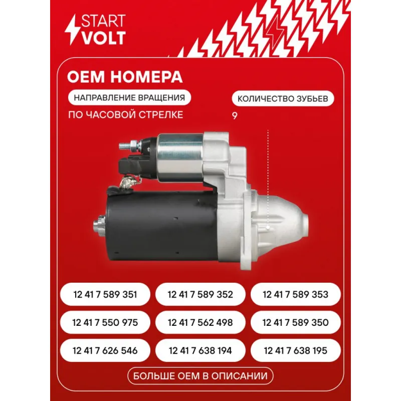Стартер для автомобилей BMW 5 F10 (10-)/3 F30 (12-)/X3 F25 (11-) 2.0T MT 1,7кВт Характеристики: Артикул: LSt 2608 OEM номера: 12 41 7 626 546, 12 41 7 638 194, 12 41 7 638 195, 12 41 7 550 975, 12 41 7 562 498, 12 41 7 589 350, 12 41 7 589 351, 12 41 7 589 352, 12 41 7 589 353, 12 41 7 610 342, 12 41 7 610 349, 12 41 7 626 547, 12 41 7 638 196, 12 41 7 638 197, 0 001 138 001, 0 001 138 002, 0 001 138 043, 0 001 138 044, 0 001 138 049, 0 001 138 057, 0 001 138 058, 0 001 138 059, 0 001 138 060 Номинальное напряжение, В: 12 Количество зубьев: 9 Направление вращения: по часовой стрелке Мощность, кВт: 1,7 Тип клеммы 30: M8 Тип клеммы 45: M8 Тип клеммы 50: 4,8x0,8 Количество резьбовых соединений: 1 Диаметр фланца, мм: 76,2 Исходное положение шестерни, мм: 25 Количество монтажных отверстий: 2 Количество на автомобиль: 1 Комплектация: Индивидуальный технический паспорт - 1 шт Стартер - 1 шт Паспорт изделия/гарантийный талон - 1 шт Гарантия: от 1 года.
