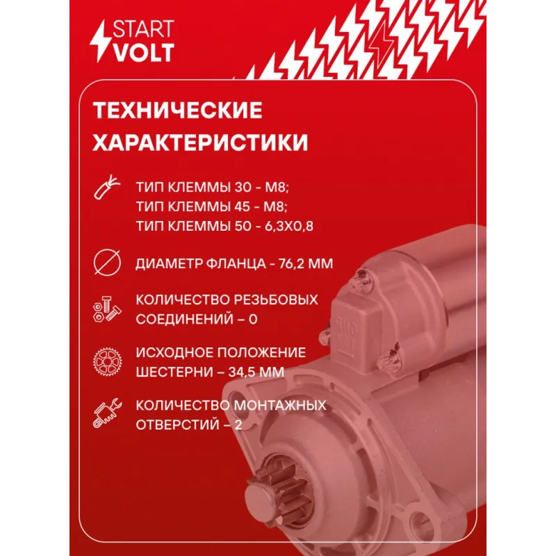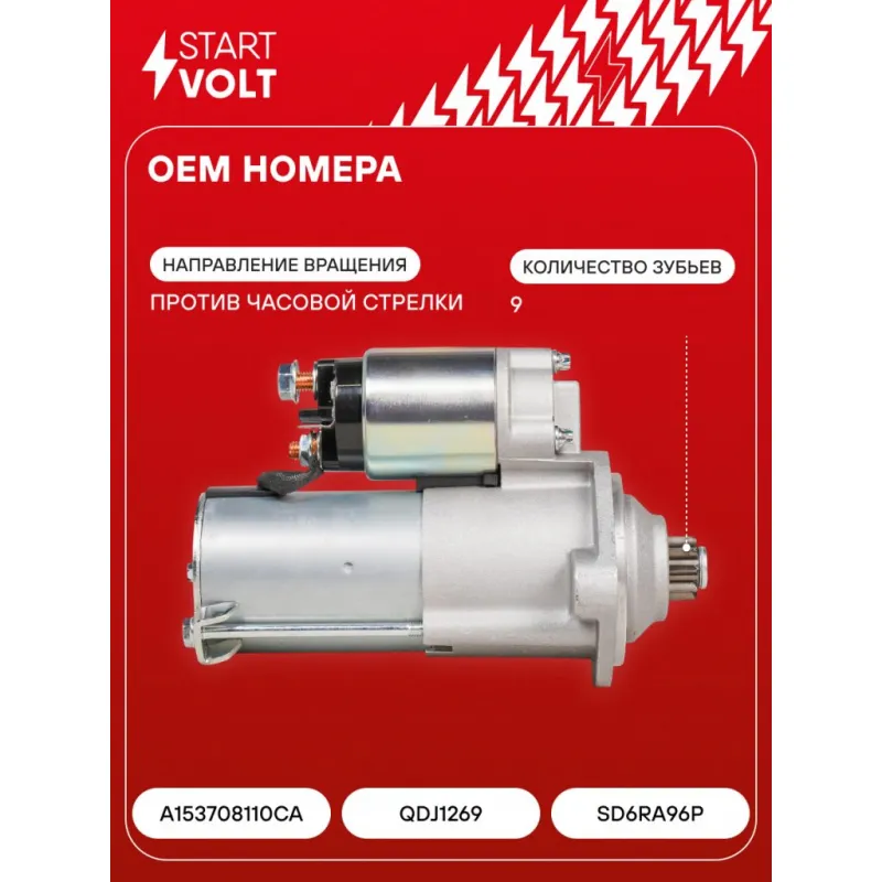 Стартер для автомобилей Chery QQ6 (06-) 1.1i 1,3кВт Описание: Оригинальный стартер STARTVOLT LSt 2732 мощностью 1,3 кВт предназначен для пуска автомобильного двигателя внутреннего сгорания. Предназначен для автомобилей CHERY QQ6.. Подбор по VIN-номеру вашего автомобиля - через кнопку 'Задать вопрос'. Специалист проверит применяемость и ответит вам. Полностью повторяет параметры оригинальных изделий, обеспечивая надёжный запуск двигателя при любых условиях. Изготовлен с соблюдением оригинальных геометрических параметров, полностью совместим с заводскими узлами. Преимущества: • Полное соответствие оригинальным узлам; • Совместим с оригинальными деталями; • Длительный срок службы и устойчивость к износу; • Стабильная работа системы запуска; • Высокоточная сборка с пооперационным контролем качества; • Каждый стартер проходит стендовое тестирование — протокол в комплекте; • Надёжность при любом запуске двигателя; • STARTVOLT — 15 лет на рынке автоэлектрики — нам доверяют профессионалы; • Сертифицирован по стандарту EAC (ЕАЭС) — соответствует требованиям безопасности и качества. Товар новый, не восстановленный. Готов к установке. Отличный выбор для уверенного запуска двигателя в любых условиях. Характеристики: Артикул: LSt 2732 OEM номера: A153708110CA, QDJ1269, SD6RA96P Номинальное напряжение, В: 12 Количество зубьев: 9 Направление вращения: против часовой стрелки Мощность, кВт: 1,3 Тип клеммы 30: M8 Тип клеммы 45: M8 Тип клеммы 50: 6,3x0,8 Количество резьбовых соединений: 0 Диаметр фланца, мм: 76,2 Исходное положение шестерни, мм: 34,5 Количество монтажных отверстий: 2 Количество на автомобиль: 1 Подходит для авто: Chery QQ6 S21 (06-) Для проверки применяемости отправьте VIN автомобиля через вкладку "Есть вопросы о товаре?" Комплектация: Индивидуальный технический паспорт - 1 шт Стартер - 1 шт Паспорт изделия/гарантийный талон - 1 шт Гарантия: от 1 года.