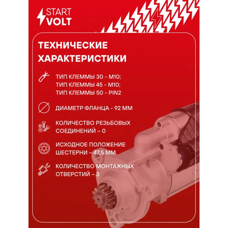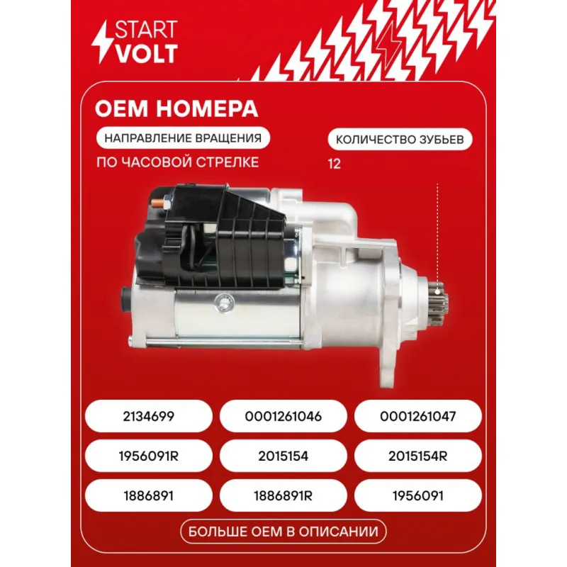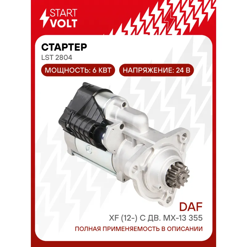 Стартер для автомобилей DAF XF (12-) с дв. MX-13 355 24В 6кВт Характеристики: Артикул: LSt 2804 OEM номера: 1886891, 1886891R, 1956091, 1956091R, 2015154, 2015154R, 2134699, 0001261046, 0001261047, 0001261071, 0001261072, 0001261087 Номинальное напряжение, В: 24 Количество зубьев: 12 Направление вращения: по часовой стрелке Мощность, кВт: 6 Тип клеммы 30: M10 Тип клеммы 45: M10 Тип клеммы 50: 2 pin Количество резьбовых соединений: 0 Диаметр фланца, мм: 92 Исходное положение шестерни, мм: 47,5 Количество монтажных отверстий: 3 Количество на автомобиль: 1 Комплектация: Индивидуальный технический паспорт - 1 шт Стартер - 1 шт Паспорт изделия/гарантийный талон - 1 шт Гарантия: от 1 года.