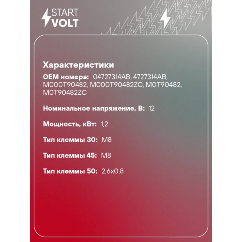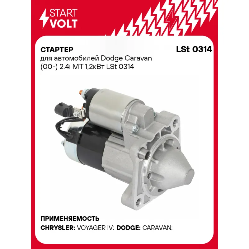 Стартер для автомобилей Dodge Caravan (00-) 2.4i MT 1,2кВт Описание: Оригинальный стартер STARTVOLT LSt 0314 мощностью 1,2 кВт предназначен для пуска автомобильного двигателя внутреннего сгорания. Предназначен для автомобилей CHRYSLER VOYAGER, DODGE CARAVAN.. Подбор по VIN-номеру вашего автомобиля - через кнопку 'Задать вопрос'. Специалист проверит применяемость и ответит вам. Полностью повторяет параметры оригинальных изделий, обеспечивая надёжный запуск двигателя при любых условиях. Изготовлен с соблюдением оригинальных геометрических параметров, полностью совместим с заводскими узлами. Преимущества: • Полное соответствие оригинальным узлам; • Совместим с оригинальными деталями; • Длительный срок службы и устойчивость к износу; • Стабильная работа системы запуска; • Высокоточная сборка с пооперационным контролем качества; • Каждый стартер проходит стендовое тестирование — протокол в комплекте; • Надёжность при любом запуске двигателя; • STARTVOLT — 15 лет на рынке автоэлектрики — нам доверяют профессионалы; • Сертифицирован по стандарту EAC (ЕАЭС) — соответствует требованиям безопасности и качества. Товар новый, не восстановленный. Готов к установке. Отличный выбор для уверенного запуска двигателя в любых условиях. Характеристики: Артикул: LSt 0314 OEM номера: 04727314AB, 4727314AB, M000T90482, M000T90482ZC, M0T90482, M0T90482ZC Количество зубьев: 10 Направление вращения: по часовой стрелке Мощность, кВт: 1,2 Тип клеммы 30: M8 Тип клеммы 45: M8 Тип клеммы 50: 2,6x0,8 Количество резьбовых соединений: 2 Диаметр фланца, мм: 82,5 Исходное положение шестерни, мм: 6 Количество монтажных отверстий: 3 Количество на автомобиль: 1 Номинальное напряжение, В: 12 Комплектация: Индивидуальный технический паспорт - 1 шт Стартер - 1 шт Паспорт изделия/гарантийный талон - 1 шт Гарантия: от 1 года.