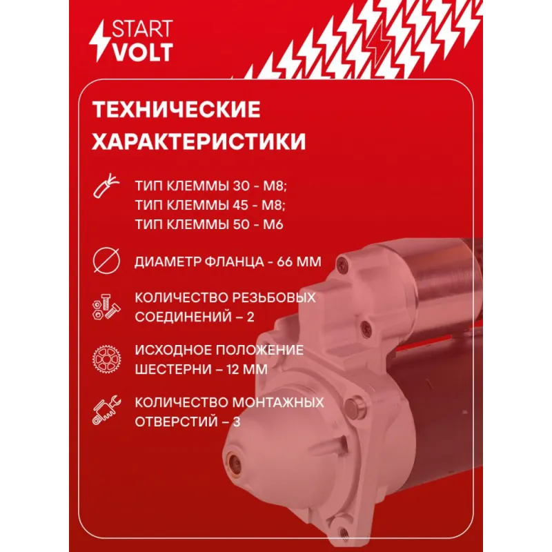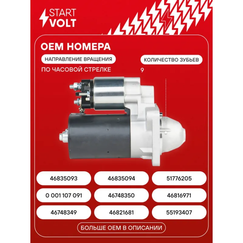 Стартер для автомобилей Fiat Albea (00-)/Doblo (01-) 1.6i 1,1кВт Описание: Оригинальный стартер STARTVOLT LSt 1618 мощностью 1,1 кВт предназначен для пуска автомобильного двигателя внутреннего сгорания. Предназначен для автомобилей FIAT DOBLO, PALIO, STILO.. Подбор по VIN-номеру вашего автомобиля - через кнопку 'Задать вопрос'. Специалист проверит применяемость и ответит вам. Полностью повторяет параметры оригинальных изделий, обеспечивая надёжный запуск двигателя при любых условиях. Изготовлен с соблюдением оригинальных геометрических параметров, полностью совместим с заводскими узлами. Преимущества: • Полное соответствие оригинальным узлам; • Совместим с оригинальными деталями; • Длительный срок службы и устойчивость к износу; • Стабильная работа системы запуска; • Высокоточная сборка с пооперационным контролем качества; • Каждый стартер проходит стендовое тестирование — протокол в комплекте; • Надёжность при любом запуске двигателя; • STARTVOLT — 15 лет на рынке автоэлектрики — нам доверяют профессионалы; • Сертифицирован по стандарту EAC (ЕАЭС) — соответствует требованиям безопасности и качества. Товар новый, не восстановленный. Готов к установке. Отличный выбор для уверенного запуска двигателя в любых условиях. Характеристики: Артикул: LSt 1618 OEM номера: 46748349, 46821681, 55193407, 0 001 107 091, 46748350, 46816971, 46835093, 46835094, 51776205, 51832956 Номинальное напряжение, В: 12 Количество зубьев: 9 Направление вращения: по часовой стрелке Мощность, кВт: 1,1 Тип клеммы 30: M8 Тип клеммы 45: M8 Тип клеммы 50: M6 Количество резьбовых соединений: 2 Диаметр фланца, мм: 66 Исходное положение шестерни, мм: 12 Количество монтажных отверстий: 3 Количество на автомобиль: 1 Подходит для авто: Fiat Doblo I (01-), Stilo (03-) Для проверки применяемости отправьте VIN автомобиля через вкладку "Есть вопросы о товаре?" Комплектация: Индивидуальный технический паспорт - 1 шт Стартер - 1 шт Паспорт изделия/гарантийный талон - 1 шт Гарантия: от 1 года.
