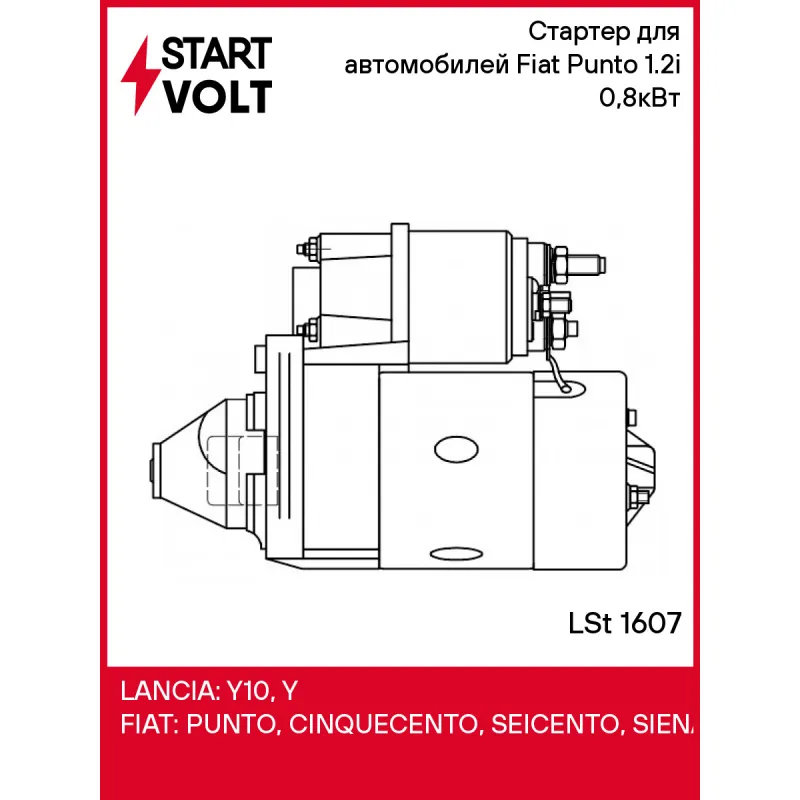Стартер для автомобилей Fiat Punto (99-) 1.2i 0,8кВт Характеристики: Артикул: LSt 1607 OEM номера: 46231531, 46429594, 46473785, 46518059, 71752055, 7772459, 55196400, 71721252, 71721308, 77722459, 7785449, 7796598, 46231532, 46430785, 46476785, 51890633, D6RA59, 432643, 455553, 0001113006, 0001116005, 0986017030, F000AL0319, 63101002, 63222888, 63222889, 63223200, E80E08KW12V, E9508KW12V, MSR829, S114949, S114949A, DSN961 Номинальное напряжение, В: 12 Количество зубьев: 9 Направление вращения: по часовой стрелке Мощность, кВт: 0,8 Тип клеммы 30: M8 Тип клеммы 45: M8 Тип клеммы 50: M6 Количество резьбовых соединений: 1 Диаметр фланца, мм: 64 Исходное положение шестерни, мм: 11,2 Количество монтажных отверстий: 3 Количество на автомобиль: 1 Комплектация: Индивидуальный технический паспорт - 1 шт Стартер - 1 шт Паспорт изделия/гарантийный талон - 1 шт Гарантия: от 1 года.