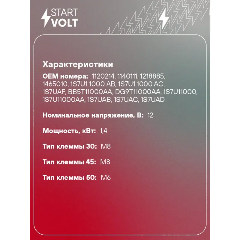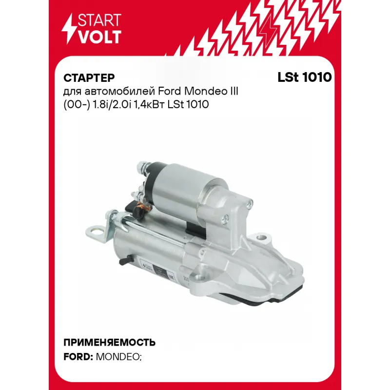 Стартер для автомобилей Ford Mondeo III (00-) 1.8i/2.0i 1,4кВт Описание: Оригинальный стартер STARTVOLT LSt 1010 мощностью 1,4 кВт предназначен для пуска автомобильного двигателя внутреннего сгорания. Предназначен для автомобилей FORD MONDEO.. Подбор по VIN-номеру вашего автомобиля - через кнопку 'Задать вопрос'. Специалист проверит применяемость и ответит вам. Полностью повторяет параметры оригинальных изделий, обеспечивая надёжный запуск двигателя при любых условиях. Изготовлен с соблюдением оригинальных геометрических параметров, полностью совместим с заводскими узлами. Преимущества: • Полное соответствие оригинальным узлам; • Совместим с оригинальными деталями; • Длительный срок службы и устойчивость к износу; • Стабильная работа системы запуска; • Высокоточная сборка с пооперационным контролем качества; • Каждый стартер проходит стендовое тестирование — протокол в комплекте; • Надёжность при любом запуске двигателя; • STARTVOLT — 15 лет на рынке автоэлектрики — нам доверяют профессионалы; • Сертифицирован по стандарту EAC (ЕАЭС) — соответствует требованиям безопасности и качества. Товар новый, не восстановленный. Готов к установке. Отличный выбор для уверенного запуска двигателя в любых условиях. Характеристики: Артикул: LSt 1010 OEM номера: 1120214, 1140111, 1218885, 1465010, 1S7U1 1000 AB, 1S7U1 1000 AC, 1S7UAF, BB5T11000AA, DG9T11000AA, 1S7U11000, 1S7U11000AA, 1S7UAB, 1S7UAC, 1S7UAD, 1S7UAE, 1S7U1 1000 AD, 1S7U 11000 AE, 1S7U 11000 AF, 20-100-01023, 1369310, 1831218 Номинальное напряжение, В: 12 Количество зубьев: 11 Направление вращения: по часовой стрелке Мощность, кВт: 1,4 Тип клеммы 30: M8 Тип клеммы 45: M8 Тип клеммы 50: M6 Количество резьбовых соединений: 0 Исходное положение шестерни, мм: 30 Количество монтажных отверстий: 2 Количество на автомобиль: 1 Комплектация: Индивидуальный технический паспорт - 1 шт Стартер - 1 шт Паспорт изделия/гарантийный талон - 1 шт Гарантия: от 1 года.