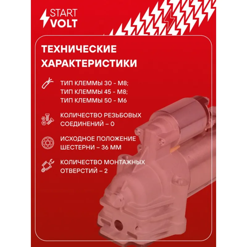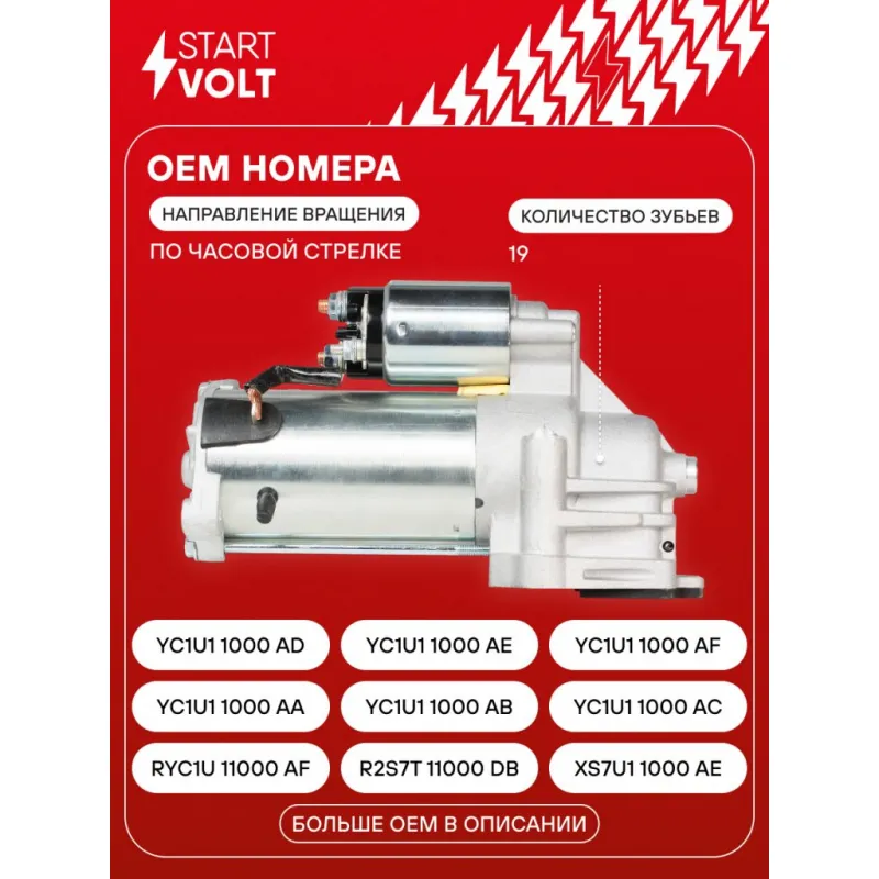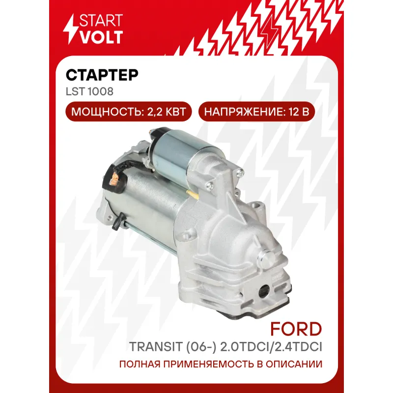 Стартер для автомобилей Ford Transit (06-) 2.0TDCi/2.4TDCi 2,2кВт Описание: Оригинальный стартер STARTVOLT LSt 1008 мощностью 2,2 кВт предназначен для пуска автомобильного двигателя внутреннего сгорания. Предназначен для автомобилей FORD MONDEO, TRANSIT, JAGUAR X-TYPE.. Подбор по VIN-номеру вашего автомобиля - через кнопку 'Задать вопрос'. Специалист проверит применяемость и ответит вам. Полностью повторяет параметры оригинальных изделий, обеспечивая надёжный запуск двигателя при любых условиях. Изготовлен с соблюдением оригинальных геометрических параметров, полностью совместим с заводскими узлами. Преимущества: • Полное соответствие оригинальным узлам; • Совместим с оригинальными деталями; • Длительный срок службы и устойчивость к износу; • Стабильная работа системы запуска; • Высокоточная сборка с пооперационным контролем качества; • Каждый стартер проходит стендовое тестирование — протокол в комплекте; • Надёжность при любом запуске двигателя; • STARTVOLT — 15 лет на рынке автоэлектрики — нам доверяют профессионалы; • Сертифицирован по стандарту EAC (ЕАЭС) — соответствует требованиям безопасности и качества. Товар новый, не восстановленный. Готов к установке. Отличный выбор для уверенного запуска двигателя в любых условиях. Характеристики: Артикул: LSt 1008 OEM номера: RYC1U 11000 AF, R2S7T 11000 DB, XS7U1 1000 AE, YC1U1 1000 AA, YC1U1 1000 AB, YC1U1 1000 AC, YC1U1 1000 AD, YC1U1 1000 AE, YC1U1 1000 AF, YC1U1 1000 AG, 1S7U1 1000 BA, 1S7U1 1000 BB, 1S7U1 1000 BC, 1096338, 1120215, 1140110, 1151641, 1214371, 1387062, 1449615, C2S 27024, C2S 47099, 1202166 Номинальное напряжение, В: 12 Количество зубьев: 19 Направление вращения: по часовой стрелке Мощность, кВт: 2,2 Тип клеммы 30: M8 Тип клеммы 45: M8 Тип клеммы 50: M6 Количество резьбовых соединений: 0 Исходное положение шестерни, мм: 36 Сопутствующий товар: Втягивающие реле: VSR 1004 Сопутствующий товар: Щёточные узлы: VBS 1008 Сопутствующий товар: Приводы стартеров (бендиксы): VCS 1008 Сопутствующий товар: Роторы: SR 1008 Количество монтажных отверстий: 2 Количество на автомобиль: 1 Комплектация: Индивидуальный технический паспорт - 1 шт Стартер - 1 шт Паспорт изделия/гарантийный талон - 1 шт Гарантия: от 1 года.