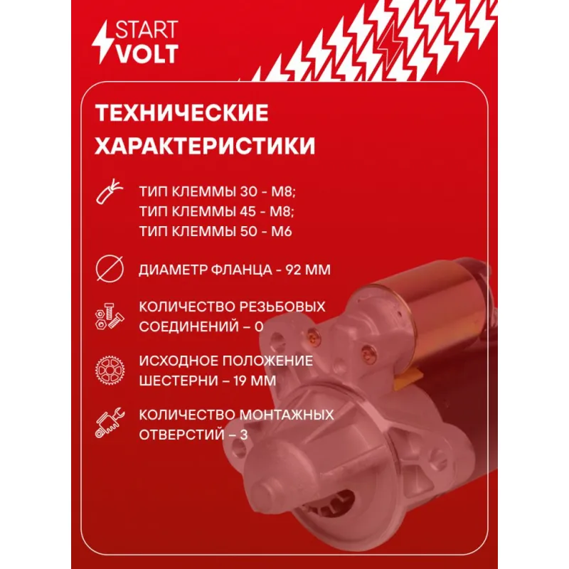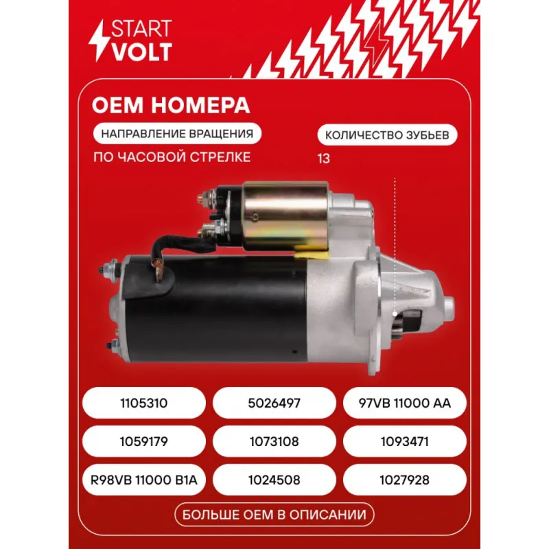 Стартер для автомобилей Ford Transit (94-) 2.5TDI 2,2кВт Описание: Оригинальный стартер STARTVOLT LSt 1002 мощностью 2,2 кВт предназначен для пуска автомобильного двигателя внутреннего сгорания. Предназначен для автомобилей FORD TRANSIT.. Подбор по VIN-номеру вашего автомобиля - через кнопку 'Задать вопрос'. Специалист проверит применяемость и ответит вам. Полностью повторяет параметры оригинальных изделий, обеспечивая надёжный запуск двигателя при любых условиях. Изготовлен с соблюдением оригинальных геометрических параметров, полностью совместим с заводскими узлами. Преимущества: • Полное соответствие оригинальным узлам; • Совместим с оригинальными деталями; • Длительный срок службы и устойчивость к износу; • Стабильная работа системы запуска; • Высокоточная сборка с пооперационным контролем качества; • Каждый стартер проходит стендовое тестирование — протокол в комплекте; • Надёжность при любом запуске двигателя; • STARTVOLT — 15 лет на рынке автоэлектрики — нам доверяют профессионалы; • Сертифицирован по стандарту EAC (ЕАЭС) — соответствует требованиям безопасности и качества. Товар новый, не восстановленный. Готов к установке. Отличный выбор для уверенного запуска двигателя в любых условиях. Характеристики: Артикул: LSt 1002 OEM номера: R98VB 11000 B1A, 1024508, 1027928, 1059179, 1073108, 1093471, 1105310, 5026497, 97VB 11000 AA, 97VB 11000 AB, 97VB 11000 AC, 98VB 11000 AA, 98VB 11000 AB, 98VB 11000 AB1A, 98VB 11000 BA, 98VB 11000 BBB, 98VB 11000 B1A, 98VB 11000 B3A, 98VB 11000 B3B Номинальное напряжение, В: 12 Количество зубьев: 13 Направление вращения: по часовой стрелке Мощность, кВт: 2,2 Тип клеммы 30: M8 Тип клеммы 45: M8 Тип клеммы 50: M6 Количество резьбовых соединений: 0 Диаметр фланца, мм: 92 Исходное положение шестерни, мм: 19 Сопутствующий товар: Втягивающие реле: VSR 1004 Количество монтажных отверстий: 3 Количество на автомобиль: 1 Подходит для авто: Ford Transit (94-) Для проверки применяемости отправьте VIN автомобиля через вкладку "Есть вопросы о товаре?" Комплектация: Индивидуальный технический паспорт - 1 шт Стартер - 1 шт Паспорт изделия/гарантийный талон - 1 шт Гарантия: от 1 года.