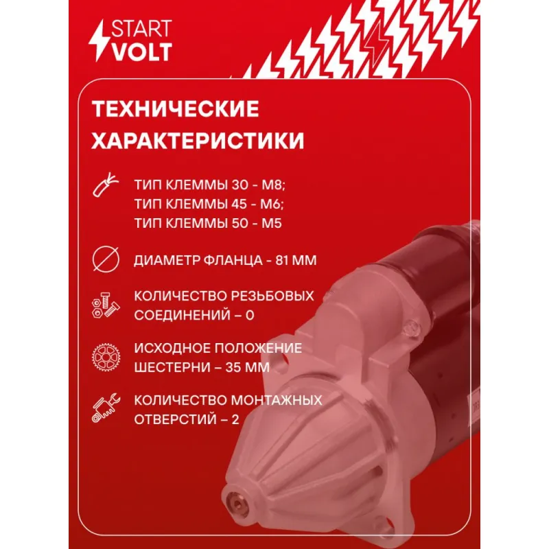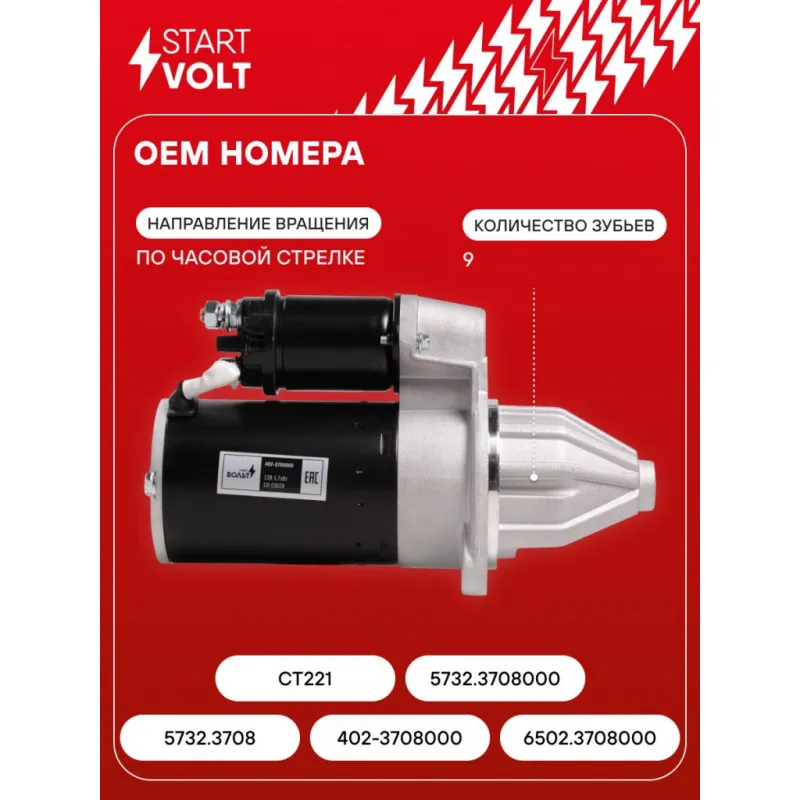 Стартер для автомобилей ГАЗ/УАЗ с дв. ЗМЗ-402/УМЗ-421 (ан. 5732.3708) 1,7кВт Описание: Новый оригинальный стартер STARTVOLT LSt 0302X мощностью 1,7 кВт предназначен для пуска автомобильного двигателя внутреннего сгорания. Предназначен для автомобилей GAZ GAZELLE, SOBOL, VOLGA, UAZ 469, 3303, 3160, 2206, 452, 3151, HUNTER, 3962, 3741.. Полностью повторяет параметры оригинальных изделий, обеспечивая надёжный запуск двигателя при любых условиях. Изготовлен с соблюдением оригинальных геометрических параметров, полностью совместим с заводскими узлами. Подбор по VIN-номеру вашего автомобиля - через кнопку 'Задать вопрос'. Специалист проверит применяемость и ответит вам. Преимущества: • Полное соответствие оригинальным узлам; • Совместим с оригинальными деталями; • Длительный срок службы и устойчивость к износу; • Стабильная работа системы запуска; • Высокоточная сборка с пооперационным контролем качества; • Каждый стартер проходит стендовое тестирование — протокол в комплекте; • Надёжность при любом запуске двигателя; • STARTVOLT — 15 лет на рынке автоэлектрики — нам доверяют профессионалы; • Гарантия 2 года; • Сертифицирован по стандарту EAC (ЕАЭС) — соответствует требованиям безопасности и качества. Товар новый, не восстановленный. Готов к установке. Отличный выбор для уверенного запуска двигателя в любых условиях. Характеристики: Артикул: LSt 0302X OEM номера: 5732.3708, 402-3708000, 6502.3708000, СТ221, 5732.3708000 Номинальное напряжение, В: 12 Количество зубьев: 9 Направление вращения: по часовой стрелке Мощность, кВт: 1,7 Тип клеммы 30: M8 Тип клеммы 45: M6 Тип клеммы 50: M5 Количество резьбовых соединений: 0 Диаметр фланца, мм: 81 Исходное положение шестерни, мм: 35 Сопутствующий товар: Втягивающие реле: VSR 0306 Сопутствующий товар: Приводы стартеров (бендиксы): VCS 0302 Количество монтажных отверстий: 2 Количество на автомобиль: 1 Подходит для авто: УАЗ 452, 3741, 3962, 3303, 469 (72-), 3151 (85-), 3160 (97-), 3162 (00-), 2206, 452, 3741, 3962, 3303, 469 (72-), 3151 (85-), 315195 ГАЗ 31029, 3302, 2217, 2705, 3221, 2752, 3102, 3110 Для проверки применяемости отправьте VIN автомобиля через вкладку "Есть вопросы о товаре?" Комплектация: Индивидуальный технический паспорт - 1 шт Стартер - 1 шт Паспорт изделия/гарантийный талон - 1 шт Гарантия: от 1 года.