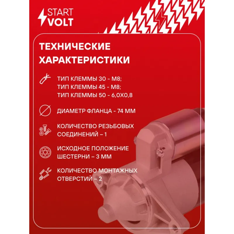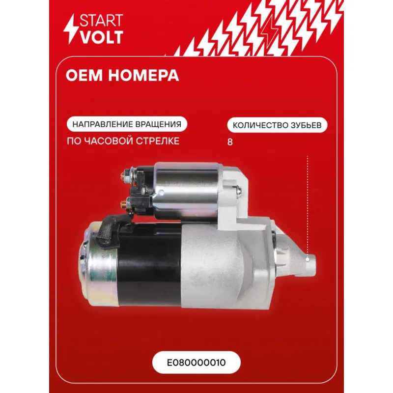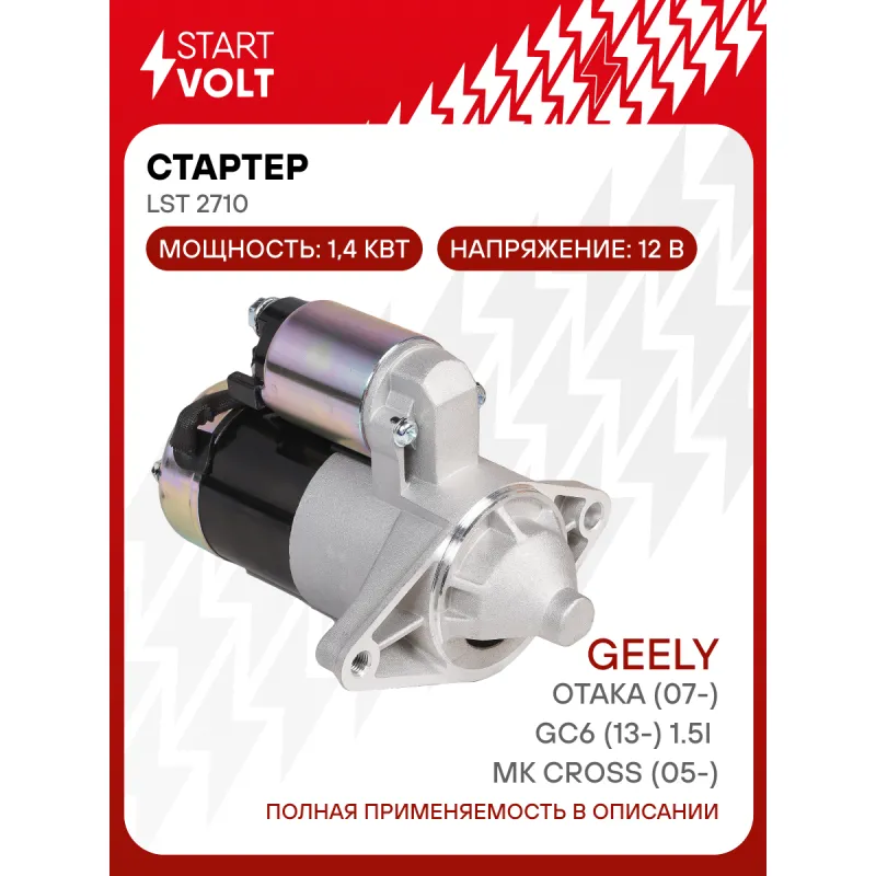 Стартер для автомобилей Geely MK Cross (05-)/Otaka (07-)/GC6 (13-) 1.5i 1,4кВт Описание: Оригинальный стартер STARTVOLT LSt 2710 мощностью 1,4 кВт предназначен для пуска автомобильного двигателя внутреннего сгорания. Предназначен для автомобилей GEELY MK, OTAKA, GC6.. Подбор по VIN-номеру вашего автомобиля - через кнопку 'Задать вопрос'. Специалист проверит применяемость и ответит вам. Полностью повторяет параметры оригинальных изделий, обеспечивая надёжный запуск двигателя при любых условиях. Изготовлен с соблюдением оригинальных геометрических параметров, полностью совместим с заводскими узлами. Преимущества: • Полное соответствие оригинальным узлам; • Совместим с оригинальными деталями; • Длительный срок службы и устойчивость к износу; • Стабильная работа системы запуска; • Высокоточная сборка с пооперационным контролем качества; • Каждый стартер проходит стендовое тестирование — протокол в комплекте; • Надёжность при любом запуске двигателя; • STARTVOLT — 15 лет на рынке автоэлектрики — нам доверяют профессионалы; • Сертифицирован по стандарту EAC (ЕАЭС) — соответствует требованиям безопасности и качества. Товар новый, не восстановленный. Готов к установке. Отличный выбор для уверенного запуска двигателя в любых условиях. Характеристики: Артикул: LSt 2710 OEM номера: E080000010 Номинальное напряжение, В: 12 Количество зубьев: 8 Направление вращения: по часовой стрелке Мощность, кВт: 1,4 Тип клеммы 30: M8 Тип клеммы 45: M8 Тип клеммы 50: 6x0,8 Количество резьбовых соединений: 1 Диаметр фланца, мм: 74 Исходное положение шестерни, мм: 3 Сопутствующий товар: Приводы стартеров (бендиксы): VCS 2620 Сопутствующий товар: Роторы: SR 0839 Количество монтажных отверстий: 2 Количество на автомобиль: 1 Комплектация: Индивидуальный технический паспорт - 1 шт Стартер - 1 шт Паспорт изделия/гарантийный талон - 1 шт Гарантия: от 1 года.