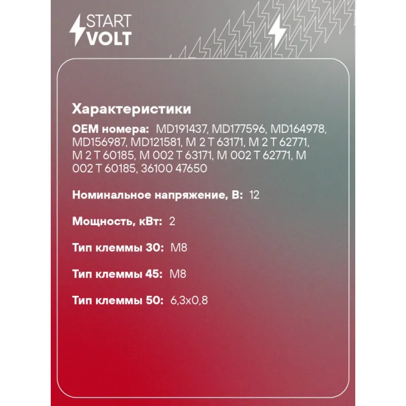 Стартер для автомобилей Hyundai H-1 Starex (96-)/Mitsubishi Pajero II (90-) 2.5TD 2кВт Описание: Оригинальный стартер STARTVOLT LSt 0849 мощностью 2 кВт предназначен для пуска автомобильного двигателя внутреннего сгорания. Предназначен для автомобилей HYUNDAI STAREX, H-1, MITSUBISHI PAJERO.. Подбор по VIN-номеру вашего автомобиля - через кнопку 'Задать вопрос'. Специалист проверит применяемость и ответит вам. Полностью повторяет параметры оригинальных изделий, обеспечивая надёжный запуск двигателя при любых условиях. Изготовлен с соблюдением оригинальных геометрических параметров, полностью совместим с заводскими узлами. Преимущества: • Полное соответствие оригинальным узлам; • Совместим с оригинальными деталями; • Длительный срок службы и устойчивость к износу; • Стабильная работа системы запуска; • Высокоточная сборка с пооперационным контролем качества; • Каждый стартер проходит стендовое тестирование — протокол в комплекте; • Надёжность при любом запуске двигателя; • STARTVOLT — 15 лет на рынке автоэлектрики — нам доверяют профессионалы; • Сертифицирован по стандарту EAC (ЕАЭС) — соответствует требованиям безопасности и качества. Товар новый, не восстановленный. Готов к установке. Отличный выбор для уверенного запуска двигателя в любых условиях. Характеристики: Артикул: LSt 0849 OEM номера: MD191437, MD177596, MD164978, MD156987, MD121581, M 2 T 63171, M 2 T 62771, M 2 T 60185, M 002 T 63171, M 002 T 62771, M 002 T 60185, 36100 47650 Номинальное напряжение, В: 12 Количество зубьев: 12 Направление вращения: против часовой стрелки Мощность, кВт: 2 Тип клеммы 30: M8 Тип клеммы 45: M8 Тип клеммы 50: 6,3x0,8 Количество резьбовых соединений: 0 Диаметр фланца, мм: 76,2 Исходное положение шестерни, мм: 62 Количество монтажных отверстий: 2 Количество на автомобиль: 1 Комплектация: Индивидуальный технический паспорт - 1 шт Стартер - 1 шт Паспорт изделия/гарантийный талон - 1 шт Гарантия: от 1 года.