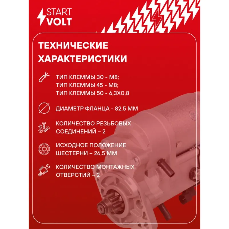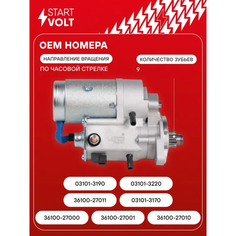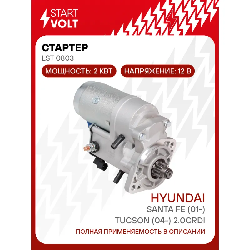Стартер для автомобилей Hyundai Santa Fe (01-)/Tucson (04-) 2.0CRDi 2кВт Описание: Оригинальный стартер STARTVOLT LSt 0803 мощностью 2 кВт предназначен для пуска автомобильного двигателя внутреннего сгорания. Предназначен для автомобилей HYUNDAI TUCSON, TRAJET, SANTA FE, ELANTRA, KIA SPORTAGE, CARENS.. Подбор по VIN-номеру вашего автомобиля - через кнопку 'Задать вопрос'. Специалист проверит применяемость и ответит вам. Полностью повторяет параметры оригинальных изделий, обеспечивая надёжный запуск двигателя при любых условиях. Изготовлен с соблюдением оригинальных геометрических параметров, полностью совместим с заводскими узлами. Преимущества: • Полное соответствие оригинальным узлам; • Совместим с оригинальными деталями; • Длительный срок службы и устойчивость к износу; • Стабильная работа системы запуска; • Высокоточная сборка с пооперационным контролем качества; • Каждый стартер проходит стендовое тестирование — протокол в комплекте; • Надёжность при любом запуске двигателя; • STARTVOLT — 15 лет на рынке автоэлектрики — нам доверяют профессионалы; • Сертифицирован по стандарту EAC (ЕАЭС) — соответствует требованиям безопасности и качества. Товар новый, не восстановленный. Готов к установке. Отличный выбор для уверенного запуска двигателя в любых условиях. Характеристики: Артикул: LSt 0803 OEM номера: 36100-27000, 36100-27001, 36100-27010, 36100-27011, 03101-3170, 03101-3190, 03101-3220 Номинальное напряжение, В: 12 Количество зубьев: 9 Направление вращения: по часовой стрелке Мощность, кВт: 2 Тип клеммы 30: M8 Тип клеммы 45: M8 Тип клеммы 50: 6,3x0,8 Количество резьбовых соединений: 2 Диаметр фланца, мм: 82,5 Исходное положение шестерни, мм: 26,5 Количество монтажных отверстий: 2 Количество на автомобиль: 1 Комплектация: Индивидуальный технический паспорт - 1 шт Стартер - 1 шт Паспорт изделия/гарантийный талон - 1 шт Гарантия: от 1 года.