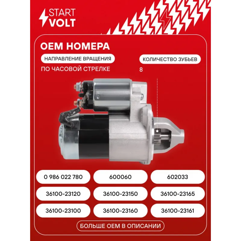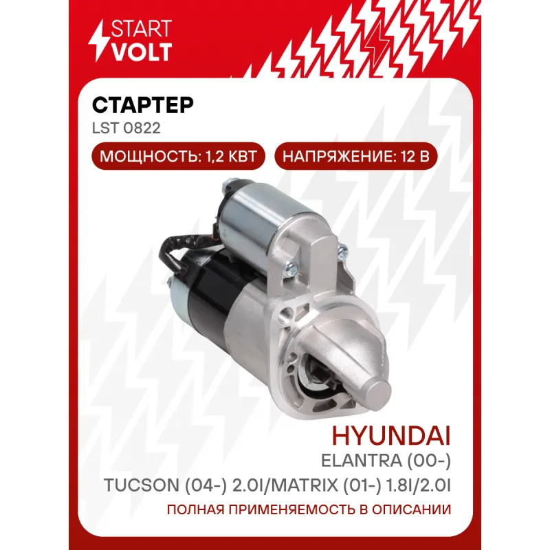 Стартер для автомобилей Hyundai Tucson (04-) 2.0i/Elantra (00-)/Matrix (01-) 1.8i/2.0i MT 1,2кВт Описание: Оригинальный стартер STARTVOLT LSt 0822 мощностью 1,2 кВт предназначен для пуска автомобильного двигателя внутреннего сгорания. Предназначен для автомобилей HYUNDAI SANTA FE, ELANTRA, TUCSON, MATRIX, LANTRA, COUPE, TRAJET, KIA CERATO, CARENS.. Подбор по VIN-номеру вашего автомобиля - через кнопку 'Задать вопрос'. Специалист проверит применяемость и ответит вам. Полностью повторяет параметры оригинальных изделий, обеспечивая надёжный запуск двигателя при любых условиях. Изготовлен с соблюдением оригинальных геометрических параметров, полностью совместим с заводскими узлами. Преимущества: • Полное соответствие оригинальным узлам; • Совместим с оригинальными деталями; • Длительный срок службы и устойчивость к износу; • Стабильная работа системы запуска; • Высокоточная сборка с пооперационным контролем качества; • Каждый стартер проходит стендовое тестирование — протокол в комплекте; • Надёжность при любом запуске двигателя; • STARTVOLT — 15 лет на рынке автоэлектрики — нам доверяют профессионалы; • Сертифицирован по стандарту EAC (ЕАЭС) — соответствует требованиям безопасности и качества. Товар новый, не восстановленный. Готов к установке. Отличный выбор для уверенного запуска двигателя в любых условиях. Характеристики: Артикул: LSt 0822 OEM номера: 36100-23100, 36100-23160, 36100-23161, 36100-23120, 36100-23150, 36100-23165, 0 986 022 780, 600060, 602033, 1250299, 438017, 438103, 455739, 455969, 600110, 600707, D6RA78, S0001250301, S0001250590, TM000A08401 Номинальное напряжение, В: 12 Количество зубьев: 8 Направление вращения: по часовой стрелке Мощность, кВт: 1,2 Тип клеммы 30: M8 Тип клеммы 45: M8 Тип клеммы 50: 6,3x0,8 Количество резьбовых соединений: 2 Диаметр фланца, мм: 77 Исходное положение шестерни, мм: 17,5 Сопутствующий товар: Щёточные узлы: VBS 2501 Сопутствующий товар: Приводы стартеров (бендиксы): VCS 0891 Сопутствующий товар: Роторы: SR 2501 Количество монтажных отверстий: 2 Количество на автомобиль: 1 Подходит для авто: Hyundai Tucson I (04-), Elantra III (00-), Santa Fe (00-) Для проверки применяемости отправьте VIN автомобиля через вкладку "Есть вопросы о товаре?" Комплектация: Индивидуальный технический паспорт - 1 шт Стартер - 1 шт Паспорт изделия/гарантийный талон - 1 шт Гарантия: от 1 года.