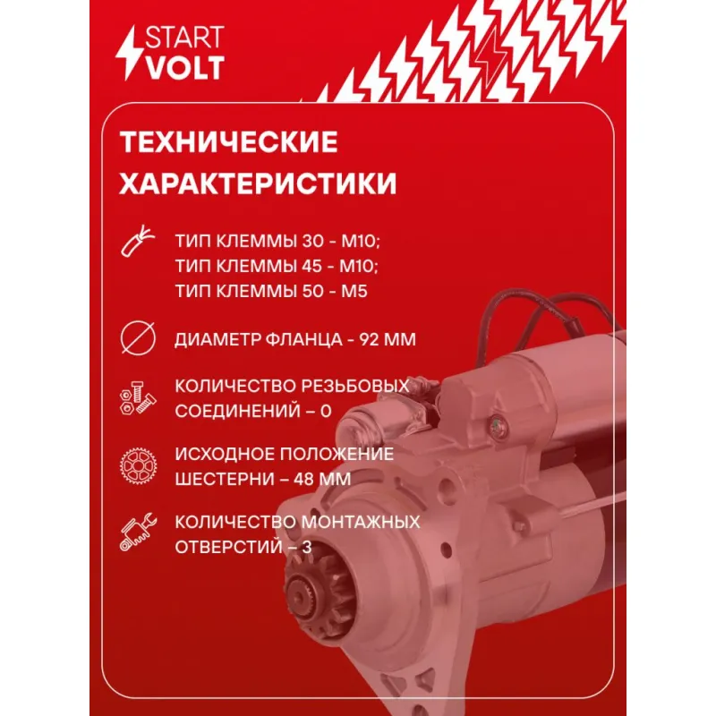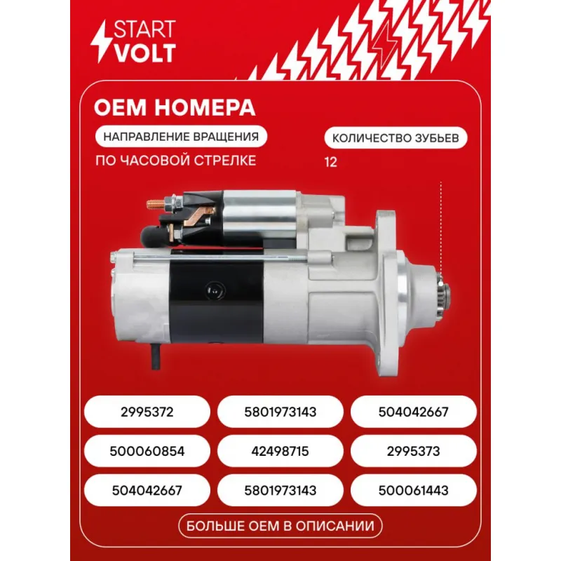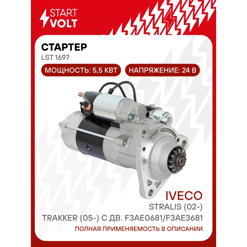 Стартер для автомобилей Iveco Stralis (02-)/Trakker (05-) с дв. F3AE0681/F3AE3681 24В 5,5кВт Характеристики: Артикул: LSt 1697 OEM номера: 504042667, 5801973143, 500061443, 500060854, 42498715, 2995373, 2995372, 0005801973143, 0000504042667, 0000500061443, 0000500060854, M 9 T 61671, M 009 T 61671 Номинальное напряжение, В: 24 Количество зубьев: 12 Направление вращения: по часовой стрелке Мощность, кВт: 5,5 Тип клеммы 30: M10 Тип клеммы 45: M10 Тип клеммы 50: M5 Количество резьбовых соединений: 0 Диаметр фланца, мм: 92 Исходное положение шестерни, мм: 48 Количество монтажных отверстий: 3 Количество на автомобиль: 1 Комплектация: Индивидуальный технический паспорт - 1 шт Стартер - 1 шт Паспорт изделия/гарантийный талон - 1 шт Гарантия: от 1 года.