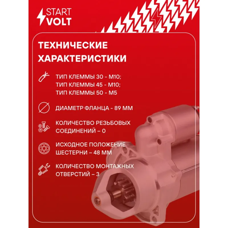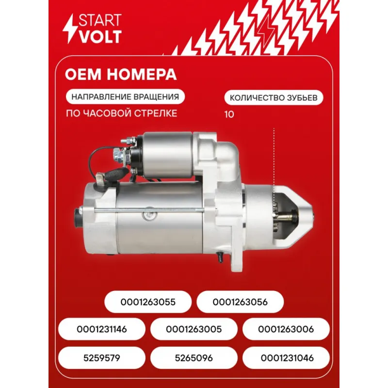 Стартер для автомобилей КАМАЗ/ПАЗ/YUTONG с дв. Cummins ISBe/ISDe 24В 4кВт Характеристики: Артикул: LSt 0709 OEM номера: 5259579, 5265096, 0001231046, 0001231146, 0001263005, 0001263006, 0001263055, 0001263056 Номинальное напряжение, В: 24 Количество зубьев: 10 Направление вращения: по часовой стрелке Мощность, кВт: 4 Тип клеммы 30: M10 Тип клеммы 45: M10 Тип клеммы 50: M5 Количество резьбовых соединений: 0 Диаметр фланца, мм: 89 Исходное положение шестерни, мм: 48 Количество монтажных отверстий: 3 Количество на автомобиль: 1 Комплектация: Индивидуальный технический паспорт - 1 шт Стартер - 1 шт Паспорт изделия/гарантийный талон - 1 шт Гарантия: от 1 года.