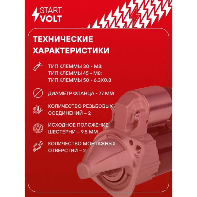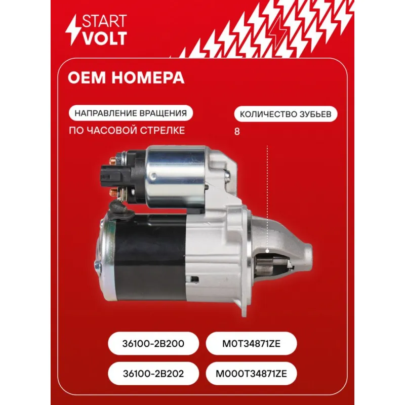 Стартер для автомобилей Kia Ceed (12-) 1.4i/1.6i/Hyundai i30 (11-) 1.6i 1,2кВт (8 зуб.) Описание: Оригинальный стартер STARTVOLT LSt 0817 мощностью 1,2 кВт предназначен для пуска автомобильного двигателя внутреннего сгорания. Предназначен для автомобилей HYUNDAI TUCSON, i30, iX20, iX35, ELANTRA, VELOSTER, SOLARIS, KIA VENGA, SPORTAGE, CEED, SOUL, CARENS, RIO.. Подбор по VIN-номеру вашего автомобиля - через кнопку 'Задать вопрос'. Специалист проверит применяемость и ответит вам. Полностью повторяет параметры оригинальных изделий, обеспечивая надёжный запуск двигателя при любых условиях. Изготовлен с соблюдением оригинальных геометрических параметров, полностью совместим с заводскими узлами. Преимущества: • Полное соответствие оригинальным узлам; • Совместим с оригинальными деталями; • Длительный срок службы и устойчивость к износу; • Стабильная работа системы запуска; • Высокоточная сборка с пооперационным контролем качества; • Каждый стартер проходит стендовое тестирование — протокол в комплекте; • Надёжность при любом запуске двигателя; • STARTVOLT — 15 лет на рынке автоэлектрики — нам доверяют профессионалы; • Сертифицирован по стандарту EAC (ЕАЭС) — соответствует требованиям безопасности и качества. Товар новый, не восстановленный. Готов к установке. Отличный выбор для уверенного запуска двигателя в любых условиях. Характеристики: Артикул: LSt 0817 OEM номера: M000T34871ZE, M0T34871ZE, 36100-2B200 Номинальное напряжение, В: 12 Количество зубьев: 8 Направление вращения: по часовой стрелке Мощность, кВт: 1,2 Тип клеммы 30: M8 Тип клеммы 45: M8 Тип клеммы 50: 6,3x0,8 Количество резьбовых соединений: 2 Диаметр фланца, мм: 77 Исходное положение шестерни, мм: 9,5 Сопутствующий товар: Втягивающие реле: VSR 1111 Сопутствующий товар: Щёточные узлы: VBS 2503 Сопутствующий товар: Приводы стартеров (бендиксы): VCS 1109 Сопутствующий товар: Роторы: SR 2503 Количество монтажных отверстий: 2 Количество на автомобиль: 1 Подходит для авто: Hyundai Elantra V (11-), i30 II (11-), Veloster (11-), iX20 (10-), Solaris I (10-), Tucson III (15-) Kia Carens III (13-), CEE'D (12-), PRO CEED (JD) (13-), Rio III (11-), Soul II (14-), Sportage III (10-), Venga (10-) Для проверки применяемости отправьте VIN автомобиля через вкладку "Есть вопросы о товаре?" Комплектация: Индивидуальный технический паспорт - 1 шт Стартер - 1 шт Паспорт изделия/гарантийный талон - 1 шт Гарантия: от 1 года.