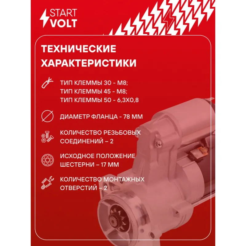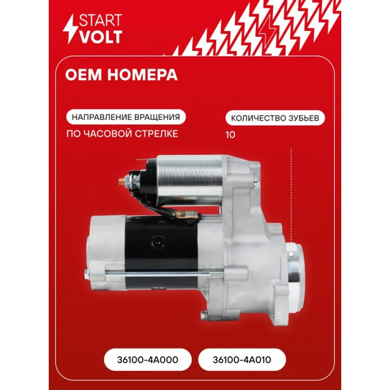 Стартер для автомобилей Kia Sorento (02-)/Hyundai H-1 (08-) 2.5CRDi 2,2кВт Описание: Оригинальный стартер STARTVOLT LSt 0804 мощностью 2,2 кВт предназначен для пуска автомобильного двигателя внутреннего сгорания. Предназначен для автомобилей HYUNDAI STAREX, H-1, PORTER, KIA SORENTO.. Подбор по VIN-номеру вашего автомобиля - через кнопку 'Задать вопрос'. Специалист проверит применяемость и ответит вам. Полностью повторяет параметры оригинальных изделий, обеспечивая надёжный запуск двигателя при любых условиях. Изготовлен с соблюдением оригинальных геометрических параметров, полностью совместим с заводскими узлами. Преимущества: • Полное соответствие оригинальным узлам; • Совместим с оригинальными деталями; • Длительный срок службы и устойчивость к износу; • Стабильная работа системы запуска; • Высокоточная сборка с пооперационным контролем качества; • Каждый стартер проходит стендовое тестирование — протокол в комплекте; • Надёжность при любом запуске двигателя; • STARTVOLT — 15 лет на рынке автоэлектрики — нам доверяют профессионалы; • Сертифицирован по стандарту EAC (ЕАЭС) — соответствует требованиям безопасности и качества. Товар новый, не восстановленный. Готов к установке. Отличный выбор для уверенного запуска двигателя в любых условиях. Характеристики: Артикул: LSt 0804 OEM номера: 36100-4A000, 36100-4A010 Номинальное напряжение, В: 12 Количество зубьев: 10 Направление вращения: по часовой стрелке Мощность, кВт: 2,2 Тип клеммы 30: M8 Тип клеммы 45: M8 Тип клеммы 50: 6,3x0,8 Количество резьбовых соединений: 2 Диаметр фланца, мм: 78 Исходное положение шестерни, мм: 17 Количество монтажных отверстий: 2 Количество на автомобиль: 1 Комплектация: Индивидуальный технический паспорт - 1 шт Стартер - 1 шт Паспорт изделия/гарантийный талон - 1 шт Гарантия: от 1 года.