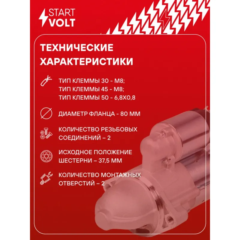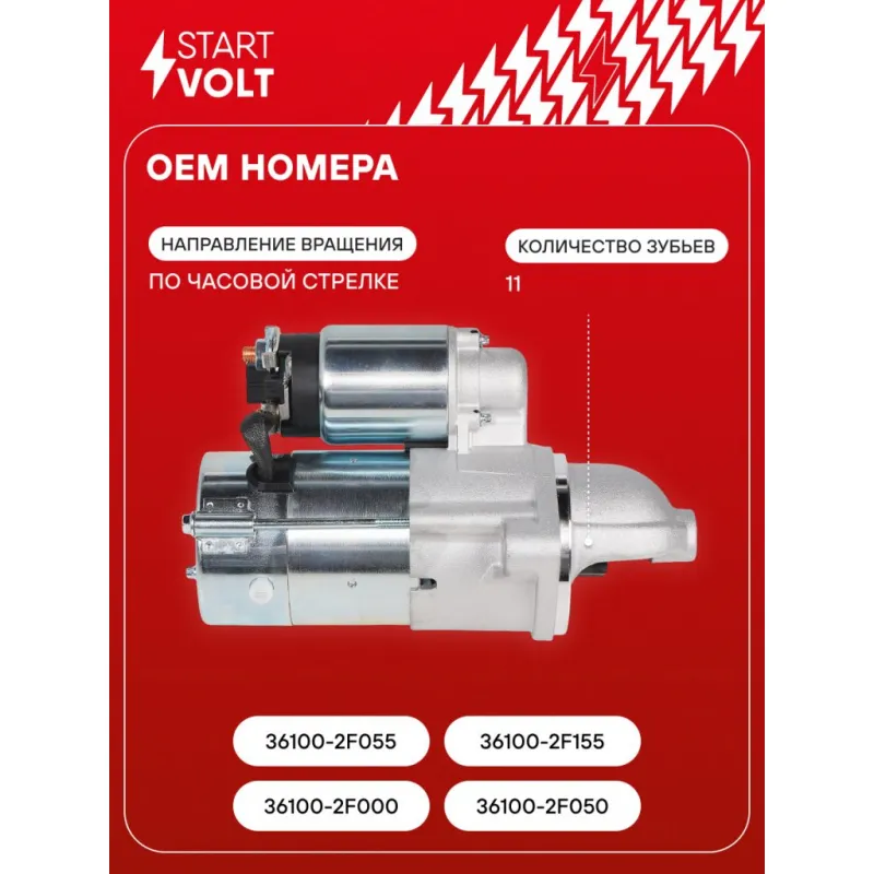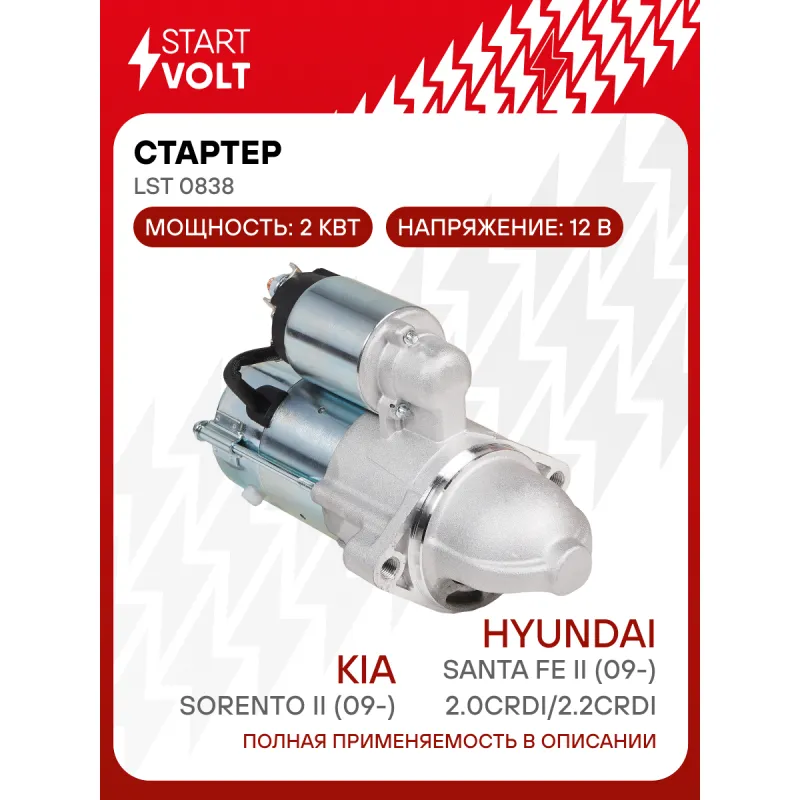 Стартер для автомобилей Kia Sorento II (09-)/Hyundai Santa Fe II (09-) 2.0CRDi/2.2CRDi 2кВт Описание: Оригинальный стартер STARTVOLT LSt 0838 мощностью 2 кВт предназначен для пуска автомобильного двигателя внутреннего сгорания. Предназначен для автомобилей HYUNDAI SANTA FE, iX35, KIA SORENTO, SPORTAGE, CARNIVAL.. Подбор по VIN-номеру вашего автомобиля - через кнопку 'Задать вопрос'. Специалист проверит применяемость и ответит вам. Полностью повторяет параметры оригинальных изделий, обеспечивая надёжный запуск двигателя при любых условиях. Изготовлен с соблюдением оригинальных геометрических параметров, полностью совместим с заводскими узлами. Преимущества: • Полное соответствие оригинальным узлам; • Совместим с оригинальными деталями; • Длительный срок службы и устойчивость к износу; • Стабильная работа системы запуска; • Высокоточная сборка с пооперационным контролем качества; • Каждый стартер проходит стендовое тестирование — протокол в комплекте; • Надёжность при любом запуске двигателя; • STARTVOLT — 15 лет на рынке автоэлектрики — нам доверяют профессионалы; • Сертифицирован по стандарту EAC (ЕАЭС) — соответствует требованиям безопасности и качества. Товар новый, не восстановленный. Готов к установке. Отличный выбор для уверенного запуска двигателя в любых условиях. Характеристики: Артикул: LSt 0838 OEM номера: 36100-2F000, 36100-2F050, 36100-2F055, 36100-2F155 Номинальное напряжение, В: 12 Количество зубьев: 11 Направление вращения: по часовой стрелке Мощность, кВт: 2 Тип клеммы 30: M8 Тип клеммы 45: M8 Тип клеммы 50: 6,3x0,8 Количество резьбовых соединений: 2 Диаметр фланца, мм: 80 Исходное положение шестерни, мм: 37,5 Сопутствующий товар: Щёточные узлы: VBS 0838 Сопутствующий товар: Приводы стартеров (бендиксы): VCS 0801 Сопутствующий товар: Роторы: SR 0838 Количество монтажных отверстий: 2 Количество на автомобиль: 1 Подходит для авто: Hyundai Santa Fe II (06-), Santa Fe II (06-), Santa Fe III (12-) Kia Sorento II (09-), Sportage III (10-) Для проверки применяемости отправьте VIN автомобиля через вкладку "Есть вопросы о товаре?" Комплектация: Индивидуальный технический паспорт - 1 шт Стартер - 1 шт Паспорт изделия/гарантийный талон - 1 шт Гарантия: от 1 года.