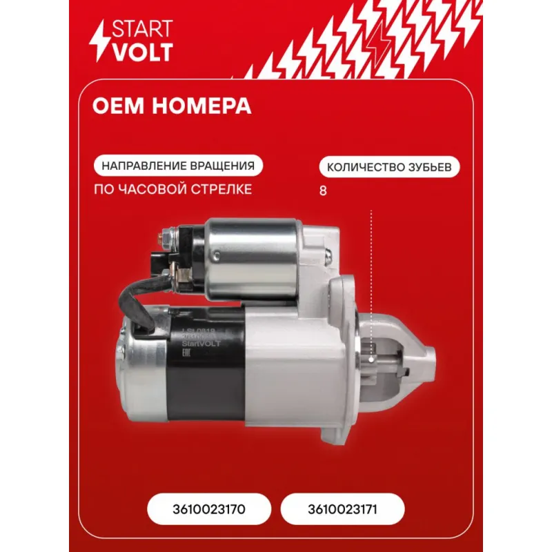 Стартер для автомобилей Kia Sportage II (04-)/Ceed (06-) 2.0i 1,2кВт Описание: Оригинальный стартер STARTVOLT LSt 0819 мощностью 1,2 кВт предназначен для пуска автомобильного двигателя внутреннего сгорания. Предназначен для автомобилей HYUNDAI i30, COUPE, KIA SPORTAGE, CEED.. Подбор по VIN-номеру вашего автомобиля - через кнопку 'Задать вопрос'. Специалист проверит применяемость и ответит вам. Полностью повторяет параметры оригинальных изделий, обеспечивая надёжный запуск двигателя при любых условиях. Изготовлен с соблюдением оригинальных геометрических параметров, полностью совместим с заводскими узлами. Преимущества: • Полное соответствие оригинальным узлам; • Совместим с оригинальными деталями; • Длительный срок службы и устойчивость к износу; • Стабильная работа системы запуска; • Высокоточная сборка с пооперационным контролем качества; • Каждый стартер проходит стендовое тестирование — протокол в комплекте; • Надёжность при любом запуске двигателя; • STARTVOLT — 15 лет на рынке автоэлектрики — нам доверяют профессионалы; • Сертифицирован по стандарту EAC (ЕАЭС) — соответствует требованиям безопасности и качества. Товар новый, не восстановленный. Готов к установке. Отличный выбор для уверенного запуска двигателя в любых условиях. Характеристики: Артикул: LSt 0819 OEM номера: 3610023170, 3610023171 Номинальное напряжение, В: 12 Количество зубьев: 8 Направление вращения: по часовой стрелке Мощность, кВт: 1,2 Тип клеммы 30: M8 Тип клеммы 45: M8 Тип клеммы 50: 6,3x0,8 Количество резьбовых соединений: 2 Диаметр фланца, мм: 77 Исходное положение шестерни, мм: 17 Сопутствующий товар: Втягивающие реле: VSR 0819 Сопутствующий товар: Щёточные узлы: VBS 2501 Сопутствующий товар: Приводы стартеров (бендиксы): VCS 0891 Сопутствующий товар: Роторы: SR 2501 Количество монтажных отверстий: 2 Количество на автомобиль: 1 Комплектация: Индивидуальный технический паспорт - 1 шт Стартер - 1 шт Паспорт изделия/гарантийный талон - 1 шт Гарантия: от 1 года.