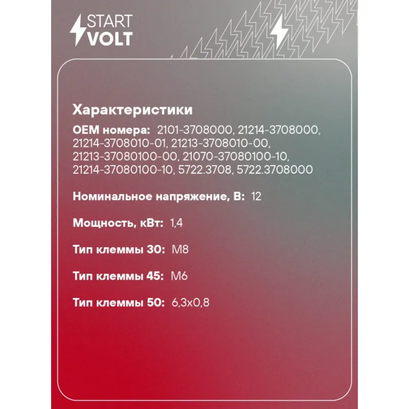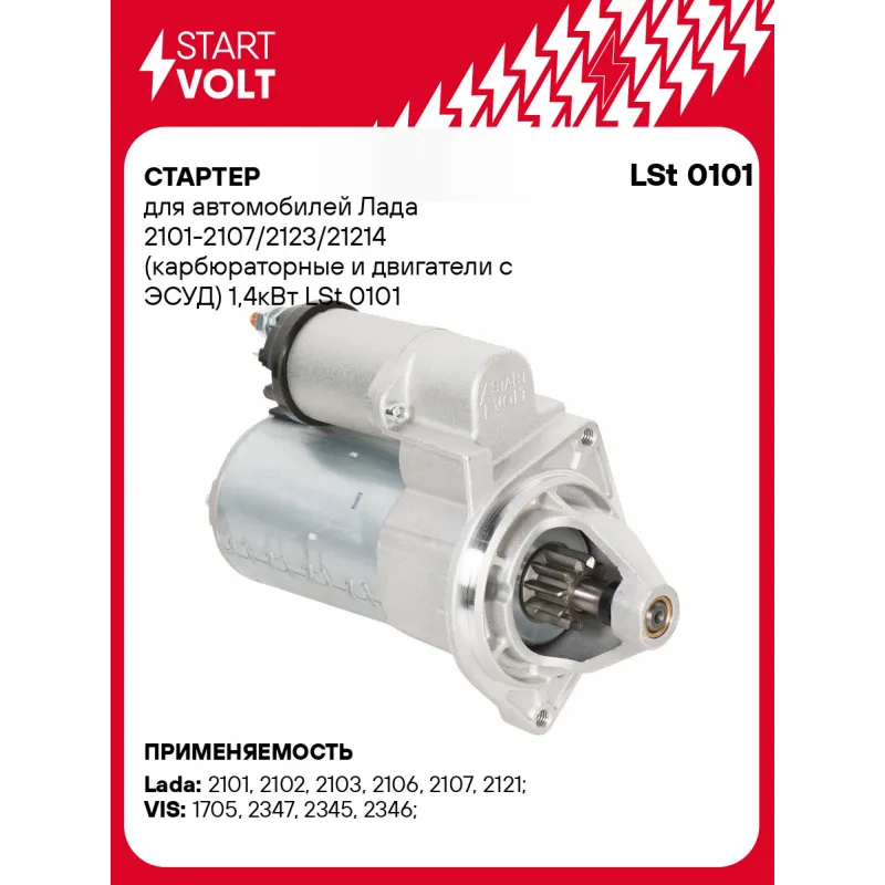 Стартер для автомобилей Лада 2101-2107/2123/21214 (карбюраторные и двигатели с ЭСУД) 1,4кВт Описание: Новый оригинальный стартер STARTVOLT LSt 0101 мощностью 1,4 кВт предназначен для пуска автомобильного двигателя внутреннего сгорания. Подходит для CHEVROLET NIVA, LADA ВАЗ 2101-2107, NIVA, Надежда, VIS 2345, 1705, 2347, 2346. с карбюраторными двигателями и двигателями с ЭСУД. Изготовлен с соблюдением оригинальных геометрических параметров, полностью совместим с заводскими узлами. Подбор по VIN-номеру вашего автомобиля - через кнопку 'Задать вопрос'. Специалист проверит применяемость и ответит вам. Преимущества: • Полное соответствие оригинальным узлам; • Совместим с оригинальными деталями; • Длительный срок службы и устойчивость к износу; • Стабильная работа системы запуска; • Высокоточная сборка с пооперационным контролем качества; • Каждый стартер проходит стендовое тестирование — протокол в комплекте; • STARTVOLT — 15 лет на рынке автоэлектрики — нам доверяют профессионалы; • Гарантия 2 года; • Сертифицирован по стандарту EAC (ЕАЭС) — соответствует требованиям безопасности и качества. Товар новый, не восстановленный. Готов к установке. Отличный выбор для уверенного запуска двигателя в любых условиях. Характеристики: Артикул: LSt 0101 OEM номера: 2101-3708000, 21214-3708000, 21214-3708010-01, 21213-3708010-00, 21213-37080100-00, 21070-37080100-10, 21214-37080100-10, 5722.3708, 5722.3708000, 21213-3708010, 8450086236, 2107.3708010-01, 5172.3708000 Номинальное напряжение, В: 12 Количество зубьев: 11 Направление вращения: по часовой стрелке Мощность, кВт: 1,4 Тип клеммы 30: M8 Тип клеммы 45: M6 Тип клеммы 50: 6,3x0,8 Количество резьбовых соединений: 3 Диаметр фланца, мм: 82,5 Исходное положение шестерни, мм: 23 Сопутствующий товар: Втягивающие реле: VSR 0101 Сопутствующий товар: Щёточные узлы: VBS 0101 Сопутствующий товар: Приводы стартеров (бендиксы): VCS 0101 Сопутствующий товар: Роторы: SR 0101 Количество монтажных отверстий: 3 Количество на автомобиль: 1 Подходит для авто: ВАЗ 2101, 2101, 2102, 2102, 2103, 2103, 2106, 2106, 2107, 2107, 2121, 2105, 21213, 2104, 2107, 2121, 2121, 2105, 21214, 2123, 2131, 2120, 21214 Urban (14-) VIS 1705, 2347, 2345, 2346 Для проверки применяемости отправьте VIN автомобиля через вкладку "Есть вопросы о товаре?" Комплектация: Индивидуальный технический паспорт - 1 шт Стартер - 1 шт Паспорт изделия/гарантийный талон - 1 шт Гарантия: от 1 года.