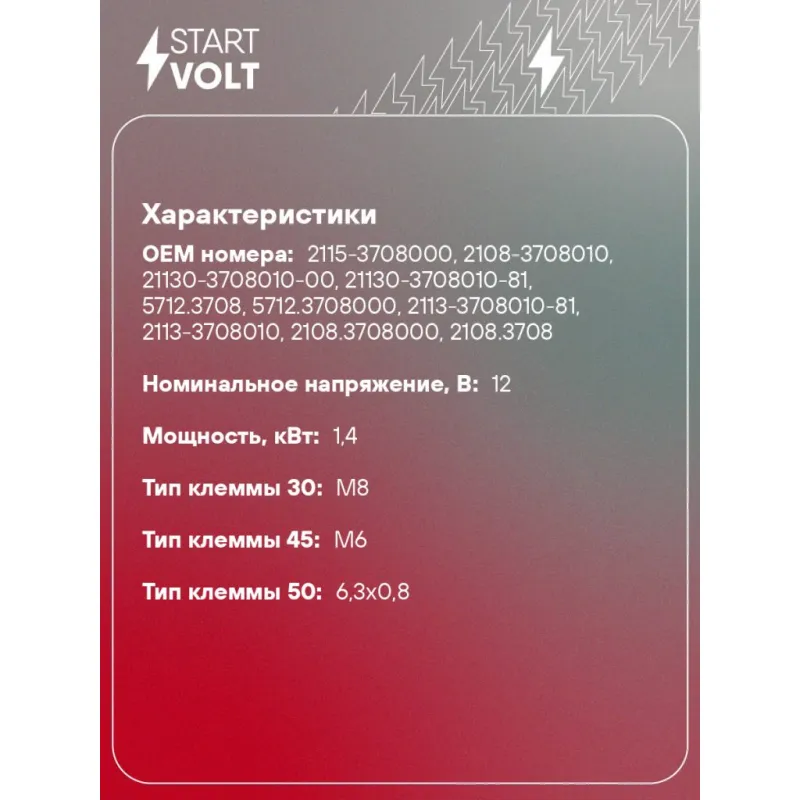 Стартер для автомобилей Лада 2108/21093/2113-2115 и модификации (карбюраторные и двигатели с ЭСУД) 1,4кВт Описание: Новый оригинальный стартер STARTVOLT LSt 0115 мощностью 1,4 кВт предназначен для пуска автомобильного двигателя внутреннего сгорания. Подходит для LADA SAMARA. с карбюраторными двигателями и двигателями с ЭСУД. Изготовлен с соблюдением оригинальных геометрических параметров, полностью совместим с заводскими узлами. Подбор по VIN-номеру вашего автомобиля - через кнопку 'Задать вопрос'. Специалист проверит применяемость и ответит вам. Преимущества: • Полное соответствие оригинальным узлам; • Совместим с оригинальными деталями; • Длительный срок службы и устойчивость к износу; • Стабильная работа системы запуска; • Высокоточная сборка с пооперационным контролем качества; • Каждый стартер проходит стендовое тестирование — протокол в комплекте; • STARTVOLT — 15 лет на рынке автоэлектрики — нам доверяют профессионалы; • Гарантия 2 года; • Сертифицирован по стандарту EAC (ЕАЭС) — соответствует требованиям безопасности и качества. Товар новый, не восстановленный. Готов к установке. Отличный выбор для уверенного запуска двигателя в любых условиях. Характеристики: Артикул: LSt 0115 OEM номера: 2115-3708000, 2108-3708010, 21130-3708010-00, 21130-3708010-81, 5712.3708, 5712.3708000, 2113-3708010-81, 2113-3708010, 2108.3708000, 2108.3708, 2109.3708010-01, 426.3708000 Номинальное напряжение, В: 12 Количество зубьев: 11 Направление вращения: против часовой стрелки Мощность, кВт: 1,4 Тип клеммы 30: M8 Тип клеммы 45: M6 Тип клеммы 50: 6,3x0,8 Количество резьбовых соединений: 0 Диаметр фланца, мм: 82,5 Исходное положение шестерни, мм: 32 Сопутствующий товар: Втягивающие реле: VSR 0101 Сопутствующий товар: Щёточные узлы: VBS 0101 Сопутствующий товар: Приводы стартеров (бендиксы): VCS 0115 Сопутствующий товар: Роторы: SR 0101 Количество монтажных отверстий: 3 Количество на автомобиль: 1 Подходит для авто: ВАЗ 2108, 2109, 21099, 21099, 2108, 2109, 21099, 2113, 2114, 2115 Для проверки применяемости отправьте VIN автомобиля через вкладку "Есть вопросы о товаре?" Комплектация: Индивидуальный технический паспорт - 1 шт Стартер - 1 шт Паспорт изделия/гарантийный талон - 1 шт Гарантия: от 1 года.