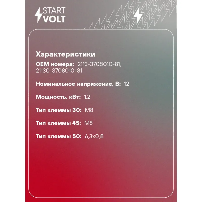Стартер для автомобилей Лада 2108/21099/2113-2115 и модификации (тип АвтоВАЗ) 1,2кВт Описание: Оригинальный стартер STARTVOLT LSt 0116 мощностью 1,2 кВт предназначен для пуска автомобильного двигателя внутреннего сгорания. Предназначен для автомобилей LADA SAMARA.. Подбор по VIN-номеру вашего автомобиля - через кнопку 'Задать вопрос'. Специалист проверит применяемость и ответит вам. Полностью повторяет параметры оригинальных изделий, обеспечивая надёжный запуск двигателя при любых условиях. Изготовлен с соблюдением оригинальных геометрических параметров, полностью совместим с заводскими узлами. Преимущества: • Полное соответствие оригинальным узлам; • Совместим с оригинальными деталями; • Длительный срок службы и устойчивость к износу; • Стабильная работа системы запуска; • Высокоточная сборка с пооперационным контролем качества; • Каждый стартер проходит стендовое тестирование — протокол в комплекте; • Надёжность при любом запуске двигателя; • STARTVOLT — 15 лет на рынке автоэлектрики — нам доверяют профессионалы; • Сертифицирован по стандарту EAC (ЕАЭС) — соответствует требованиям безопасности и качества. Товар новый, не восстановленный. Готов к установке. Отличный выбор для уверенного запуска двигателя в любых условиях. Характеристики: Артикул: LSt 0116 OEM номера: 2113-3708010-81, 21130-3708010-81 Номинальное напряжение, В: 12 Количество зубьев: 11 Направление вращения: против часовой стрелки Мощность, кВт: 1,2 Тип клеммы 30: M8 Тип клеммы 45: M8 Тип клеммы 50: 6,3x0,8 Количество резьбовых соединений: 0 Диаметр фланца, мм: 82,5 Исходное положение шестерни, мм: 34 Количество монтажных отверстий: 3 Количество на автомобиль: 1 Комплектация: Индивидуальный технический паспорт - 1 шт Стартер - 1 шт Паспорт изделия/гарантийный талон - 1 шт Гарантия: от 1 года.
