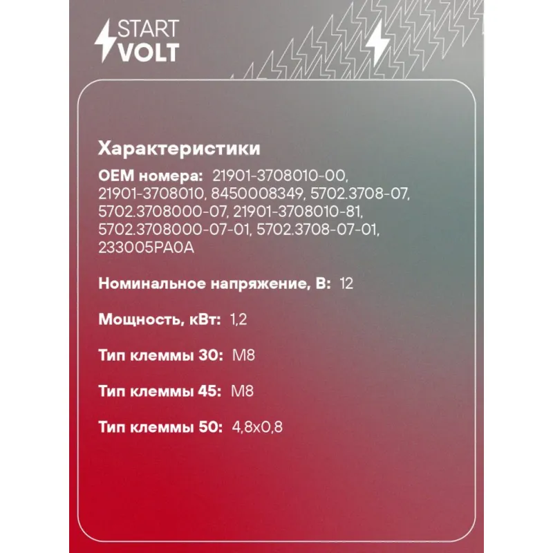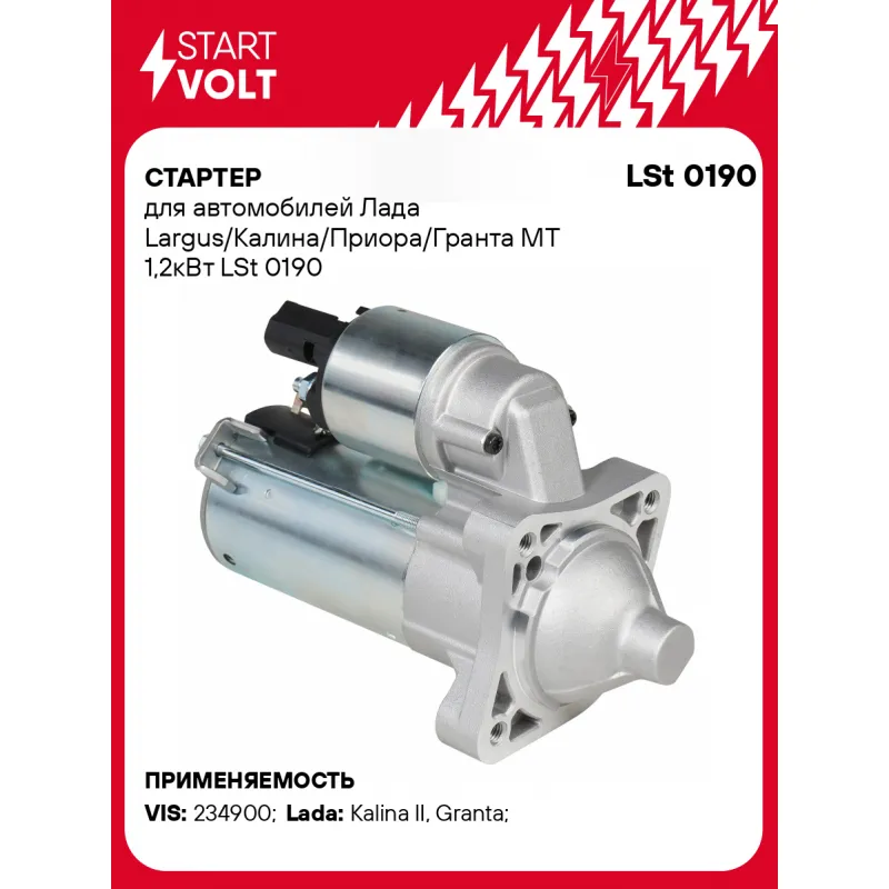 Стартер для автомобилей Лада Largus/Калина/Приора/Гранта MT 1,2кВт Описание: Новый оригинальный стартер STARTVOLT LSt 0190 мощностью 1,2 кВт предназначен для пуска автомобильного двигателя внутреннего сгорания. Подходит для LADA KALINA, GRANTA, XRAY, VESTA, LARGUS, VIS 2349 GRANTA.. Изготовлен с соблюдением оригинальных геометрических параметров, полностью совместим с заводскими узлами. Подбор по VIN-номеру вашего автомобиля - через кнопку 'Задать вопрос'. Специалист проверит применяемость и ответит вам. Преимущества: • Полное соответствие оригинальным узлам; • Совместим с оригинальными деталями; • Длительный срок службы и устойчивость к износу; • Стабильная работа системы запуска; • Высокоточная сборка с пооперационным контролем качества; • Каждый стартер проходит стендовое тестирование — протокол в комплекте; • STARTVOLT — 15 лет на рынке автоэлектрики — нам доверяют профессионалы; • Гарантия 2 года; • Сертифицирован по стандарту EAC (ЕАЭС) — соответствует требованиям безопасности и качества. Товар новый, не восстановленный. Готов к установке. Отличный выбор для уверенного запуска двигателя в любых условиях. Характеристики: Артикул: LSt 0190 OEM номера: 21901-3708010-00, 21901-3708010, 8450008349, 5702.3708-07, 5702.3708000-07, 21901-3708010-81, 5702.3708000-07-01, 5702.3708-07-01, 233005PA0A, TS12E901, 438285 Номинальное напряжение, В: 12 Количество зубьев: 11 Направление вращения: по часовой стрелке Мощность, кВт: 1,2 Тип клеммы 30: M8 Тип клеммы 45: M8 Тип клеммы 50: 4,8x0,8 Количество резьбовых соединений: 3 Диаметр фланца, мм: 66 Исходное положение шестерни, мм: 6 Сопутствующий товар: Втягивающие реле: VSR 0190 Сопутствующий товар: Приводы стартеров (бендиксы): VCS 0190 Количество монтажных отверстий: 3 Количество на автомобиль: 1 Подходящий разъем AIRLINE:: AECC231 Подходит для авто: VIS 234900 ВАЗ Kalina II (13-), Granta (10-) Для проверки применяемости отправьте VIN автомобиля через вкладку "Есть вопросы о товаре?" Комплектация: Индивидуальный технический паспорт - 1 шт Стартер - 1 шт Паспорт изделия/гарантийный талон - 1 шт Гарантия: от 1 года.