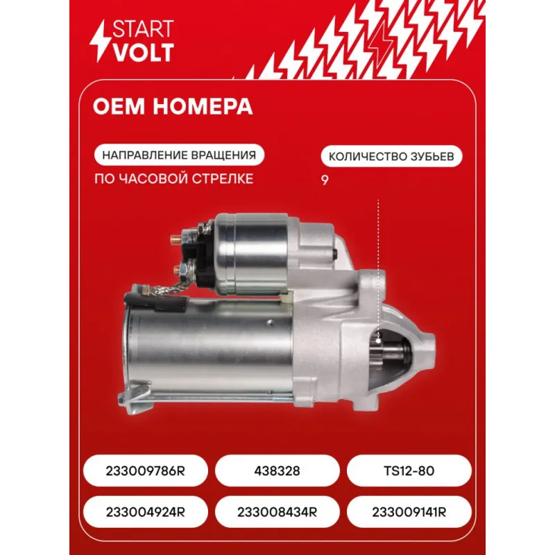Стартер для автомобилей Лада Largus (12-)/Renault Logan (04-)/(13-) K4M 1.6i 1,2кВт Описание: Оригинальный стартер STARTVOLT LSt 0907 мощностью 1,2 кВт предназначен для пуска автомобильного двигателя внутреннего сгорания. Предназначен для автомобилей DACIA SANDERO, LOGAN, DUSTER, LADA LARGUS, NISSAN KUBISTAR, BLUEBIRD SYLPHY, RENAULT SCENIC, SANDERO / STEPWAY, MEGANE, LOGAN, LAGUNA, KANGOO, LOGAN / STEPWAY.. Подбор по VIN-номеру вашего автомобиля - через кнопку 'Задать вопрос'. Специалист проверит применяемость и ответит вам. Полностью повторяет параметры оригинальных изделий, обеспечивая надёжный запуск двигателя при любых условиях. Изготовлен с соблюдением оригинальных геометрических параметров, полностью совместим с заводскими узлами. Преимущества: • Полное соответствие оригинальным узлам; • Совместим с оригинальными деталями; • Длительный срок службы и устойчивость к износу; • Стабильная работа системы запуска; • Высокоточная сборка с пооперационным контролем качества; • Каждый стартер проходит стендовое тестирование — протокол в комплекте; • Надёжность при любом запуске двигателя; • STARTVOLT — 15 лет на рынке автоэлектрики — нам доверяют профессионалы; • Сертифицирован по стандарту EAC (ЕАЭС) — соответствует требованиям безопасности и качества. Товар новый, не восстановленный. Готов к установке. Отличный выбор для уверенного запуска двигателя в любых условиях. Характеристики: Артикул: LSt 0907 OEM номера: 233004924R, 233008434R, 233009141R, 233009786R, 438328, TS12-80 Номинальное напряжение, В: 12 Количество зубьев: 9 Направление вращения: по часовой стрелке Мощность, кВт: 1,2 Тип клеммы 30: M8 Тип клеммы 45: M8 Тип клеммы 50: M5 Количество резьбовых соединений: 3 Диаметр фланца, мм: 64 Исходное положение шестерни, мм: -0,7 Сопутствующий товар: Втягивающие реле: VSR 0907 Сопутствующий товар: Щёточные узлы: VBS 0907 Сопутствующий товар: Приводы стартеров (бендиксы): VCS 0907 Количество монтажных отверстий: 3 Количество на автомобиль: 1 Подходит для авто: Renault Logan (04-), Sandero I (09-), Logan (08-), Logan II (12-) ВАЗ Largus (12-) Nissan Almera G15 (12-) Для проверки применяемости отправьте VIN автомобиля через вкладку "Есть вопросы о товаре?" Комплектация: Индивидуальный технический паспорт - 1 шт Стартер - 1 шт Паспорт изделия/гарантийный талон - 1 шт Гарантия: от 1 года.