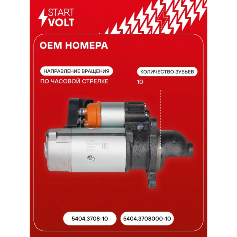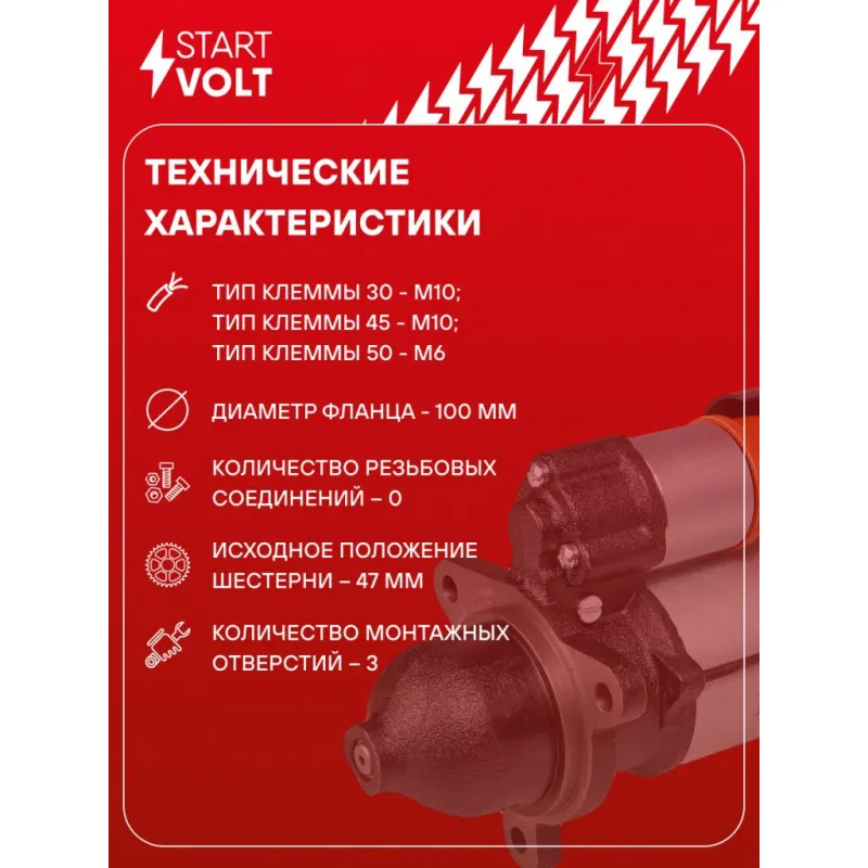 Стартер для автомобилей МАЗ/МТЗ/Амкодор с дв. ММЗ Д-260/262/263/265 ЕВРО-2/3 24В 9кВт Описание: Новый оригинальный стартер STARTVOLT LSt 1204 мощностью 9 кВт предназначен для пуска автомобильного двигателя внутреннего сгорания. Предназначен для автомобилей . Полностью повторяет параметры оригинальных изделий, обеспечивая надёжный запуск двигателя при любых условиях. Изготовлен с соблюдением оригинальных геометрических параметров, полностью совместим с заводскими узлами. Подбор по VIN-номеру вашего автомобиля - через кнопку 'Задать вопрос'. Специалист проверит применяемость и ответит вам. Преимущества: • Полное соответствие оригинальным узлам; • Совместим с оригинальными деталями; • Длительный срок службы и устойчивость к износу; • Стабильная работа системы запуска; • Высокоточная сборка с пооперационным контролем качества; • Каждый стартер проходит стендовое тестирование — протокол в комплекте; • Надёжность при любом запуске двигателя; • STARTVOLT — 15 лет на рынке автоэлектрики — нам доверяют профессионалы; • Гарантия 2 года; • Сертифицирован по стандарту EAC (ЕАЭС) — соответствует требованиям безопасности и качества. Товар новый, не восстановленный. Готов к установке. Отличный выбор для уверенного запуска двигателя в любых условиях. Характеристики: Артикул: LSt 1204 OEM номера: 5404.3708-10, 5404.3708000-10 Номинальное напряжение, В: 24 Количество зубьев: 10 Направление вращения: по часовой стрелке Мощность, кВт: 9 Тип клеммы 30: M10 Тип клеммы 45: M10 Тип клеммы 50: M6 Количество резьбовых соединений: 0 Диаметр фланца, мм: 100 Исходное положение шестерни, мм: 47 Сопутствующий товар: Втягивающие реле: VSR 0316 Сопутствующий товар: Щёточные узлы: VBS 0702 Сопутствующий товар: Приводы стартеров (бендиксы): VCS 0311 Сопутствующий товар: Роторы: SR 0702 Количество монтажных отверстий: 3 Количество на автомобиль: 1 Комплектация: Индивидуальный технический паспорт - 1 шт Стартер - 1 шт Паспорт изделия/гарантийный талон - 1 шт Гарантия: от 1 года.