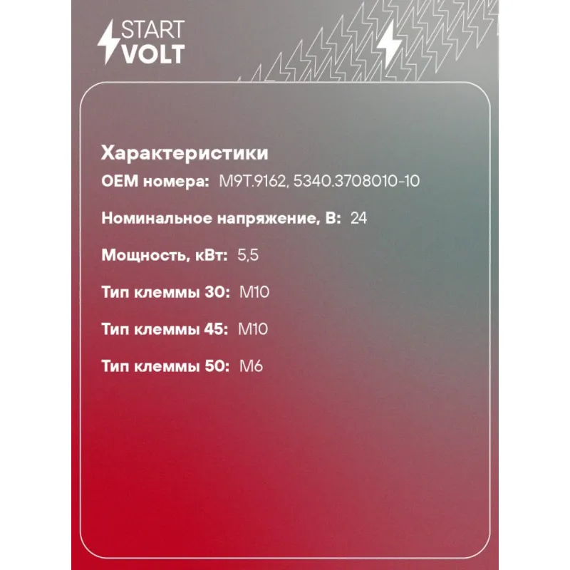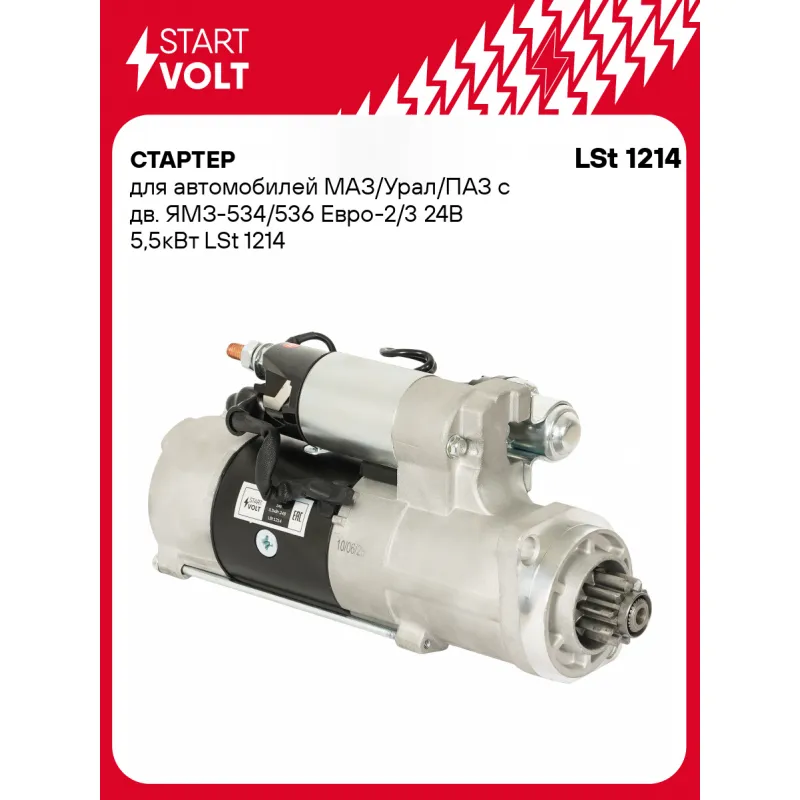 Стартер для автомобилей МАЗ/Урал/ПАЗ с дв. ЯМЗ-534/536 Евро-2/3 24В 5,5кВт Описание: Оригинальный стартер STARTVOLT LSt 1214 мощностью 5,5 кВт предназначен для пуска автомобильного двигателя внутреннего сгорания. Предназначен для автомобилей . Подбор по VIN-номеру вашего автомобиля - через кнопку 'Задать вопрос'. Специалист проверит применяемость и ответит вам. Полностью повторяет параметры оригинальных изделий, обеспечивая надёжный запуск двигателя при любых условиях. Изготовлен с соблюдением оригинальных геометрических параметров, полностью совместим с заводскими узлами. Преимущества: • Полное соответствие оригинальным узлам; • Совместим с оригинальными деталями; • Длительный срок службы и устойчивость к износу; • Стабильная работа системы запуска; • Высокоточная сборка с пооперационным контролем качества; • Каждый стартер проходит стендовое тестирование — протокол в комплекте; • Надёжность при любом запуске двигателя; • STARTVOLT — 15 лет на рынке автоэлектрики — нам доверяют профессионалы; • Сертифицирован по стандарту EAC (ЕАЭС) — соответствует требованиям безопасности и качества. Товар новый, не восстановленный. Готов к установке. Отличный выбор для уверенного запуска двигателя в любых условиях. Характеристики: Артикул: LSt 1214 OEM номера: М9Т.9162, 5340.3708010-10 Номинальное напряжение, В: 24 Количество зубьев: 10 Направление вращения: по часовой стрелке Мощность, кВт: 5,5 Тип клеммы 30: M10 Тип клеммы 45: M10 Тип клеммы 50: M6 Количество резьбовых соединений: 0 Диаметр фланца, мм: 82,5 Исходное положение шестерни, мм: 34 Количество монтажных отверстий: 2 Количество на автомобиль: 1 Комплектация: Индивидуальный технический паспорт - 1 шт Стартер - 1 шт Паспорт изделия/гарантийный талон - 1 шт Гарантия: от 1 года.
