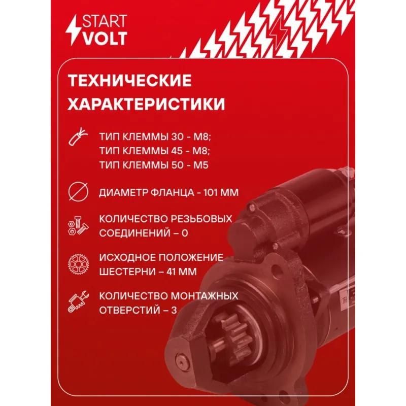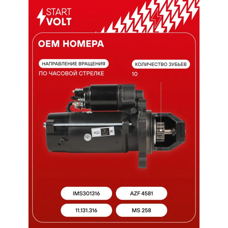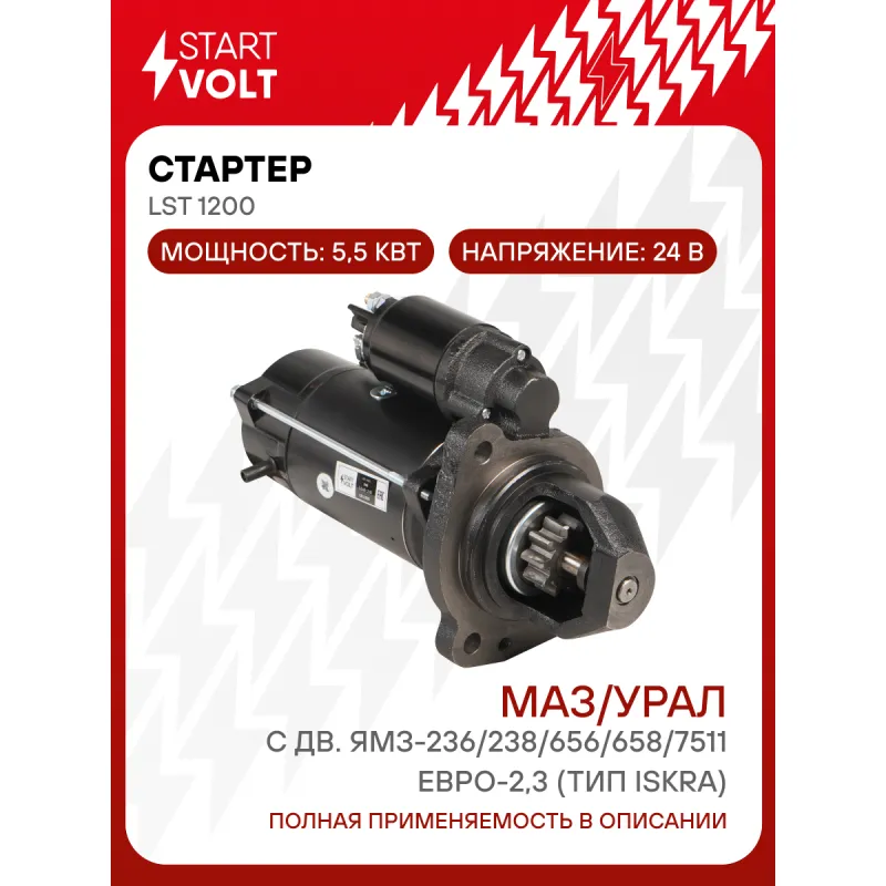 Стартер для автомобилей МАЗ/УРАЛ с дв. ЯМЗ-236/238/656/658/7511 ЕВРО-2,3 (тип Iskra) 24В 5,5кВт Характеристики: Артикул: LSt 1200 OEM номера: 11.131.316, MS 258, IMS301316, AZF 4581 Номинальное напряжение, В: 24 Количество зубьев: 10 Направление вращения: по часовой стрелке Мощность, кВт: 5,5 Тип клеммы 30: M8 Тип клеммы 45: M8 Тип клеммы 50: M5 Количество резьбовых соединений: 0 Диаметр фланца, мм: 101 Исходное положение шестерни, мм: 41 Количество монтажных отверстий: 3 Количество на автомобиль: 1 Подходит для авто: Ural 5557, 4320 Для проверки применяемости отправьте VIN автомобиля через вкладку "Есть вопросы о товаре?" Комплектация: Индивидуальный технический паспорт - 1 шт Стартер - 1 шт Паспорт изделия/гарантийный талон - 1 шт Гарантия: от 1 года.