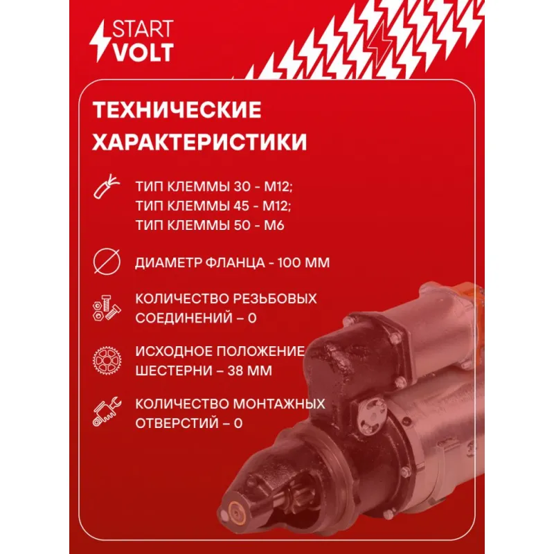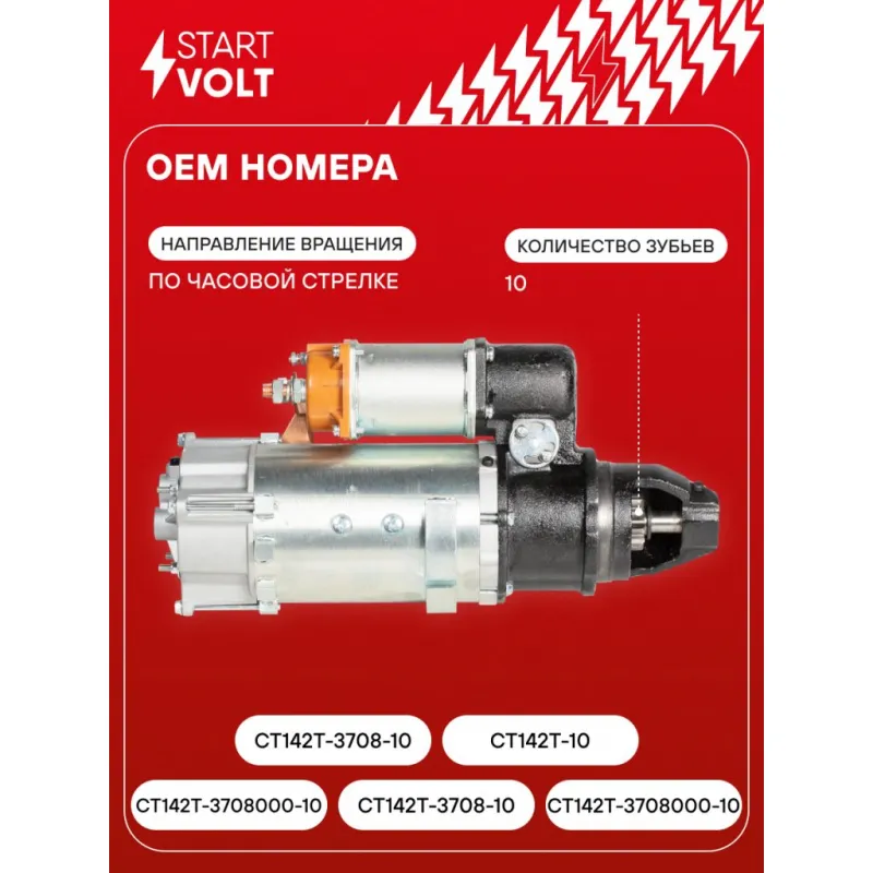 Стартер для автомобилей МАЗ/УРАЛ с дв. ЯМЗ-236/238/656/658/7511 ЕВРО-2/3 24В 9,2кВт Описание: Новый оригинальный стартер STARTVOLT LSt 1202 мощностью 9,2 кВт предназначен для пуска автомобильного двигателя внутреннего сгорания. Предназначен для автомобилей . Полностью повторяет параметры оригинальных изделий, обеспечивая надёжный запуск двигателя при любых условиях. Изготовлен с соблюдением оригинальных геометрических параметров, полностью совместим с заводскими узлами. Подбор по VIN-номеру вашего автомобиля - через кнопку 'Задать вопрос'. Специалист проверит применяемость и ответит вам. Преимущества: • Полное соответствие оригинальным узлам; • Совместим с оригинальными деталями; • Длительный срок службы и устойчивость к износу; • Стабильная работа системы запуска; • Высокоточная сборка с пооперационным контролем качества; • Каждый стартер проходит стендовое тестирование — протокол в комплекте; • Надёжность при любом запуске двигателя; • STARTVOLT — 15 лет на рынке автоэлектрики — нам доверяют профессионалы; • Гарантия 2 года; • Сертифицирован по стандарту EAC (ЕАЭС) — соответствует требованиям безопасности и качества. Товар новый, не восстановленный. Готов к установке. Отличный выбор для уверенного запуска двигателя в любых условиях. Характеристики: Артикул: LSt 1202 OEM номера: СТ142Т-3708000-10, СТ142Т-3708-10, CT142T-3708000-10, CT142T-3708-10, CT142T-10 Номинальное напряжение, В: 24 Количество зубьев: 10 Направление вращения: по часовой стрелке Мощность, кВт: 9,2 Тип клеммы 30: M12 Тип клеммы 45: M12 Тип клеммы 50: M6 Количество резьбовых соединений: 0 Диаметр фланца, мм: 100 Исходное положение шестерни, мм: 38 Сопутствующий товар: Втягивающие реле: VSR 0720 Сопутствующий товар: Щёточные узлы: VBS 0720 Сопутствующий товар: Приводы стартеров (бендиксы): VCS 0701 Сопутствующий товар: Роторы: SR 0711 Количество монтажных отверстий: 0 Количество на автомобиль: 1 Тип крепления: под хомут Модуль: 3,75 Комплектация: Индивидуальный технический паспорт - 1 шт Стартер - 1 шт Паспорт изделия/гарантийный талон - 1 шт Гарантия: от 1 года.