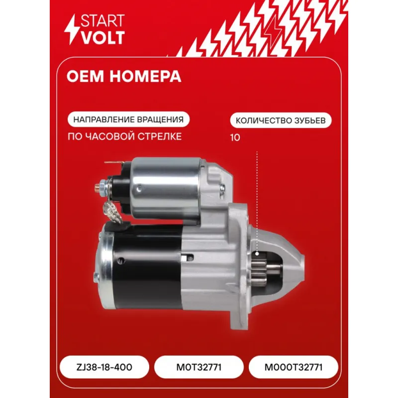 Стартер для автомобилей Mazda 3 BL (08-) 1.6i/2 DE (07-) 1.5i 1,2кВт Описание: Оригинальный стартер STARTVOLT LSt 2503 мощностью 1,2 кВт предназначен для пуска автомобильного двигателя внутреннего сгорания. Предназначен для автомобилей MAZDA 3, 2.. Подбор по VIN-номеру вашего автомобиля - через кнопку 'Задать вопрос'. Специалист проверит применяемость и ответит вам. Полностью повторяет параметры оригинальных изделий, обеспечивая надёжный запуск двигателя при любых условиях. Изготовлен с соблюдением оригинальных геометрических параметров, полностью совместим с заводскими узлами. Преимущества: • Полное соответствие оригинальным узлам; • Совместим с оригинальными деталями; • Длительный срок службы и устойчивость к износу; • Стабильная работа системы запуска; • Высокоточная сборка с пооперационным контролем качества; • Каждый стартер проходит стендовое тестирование — протокол в комплекте; • Надёжность при любом запуске двигателя; • STARTVOLT — 15 лет на рынке автоэлектрики — нам доверяют профессионалы; • Сертифицирован по стандарту EAC (ЕАЭС) — соответствует требованиям безопасности и качества. Товар новый, не восстановленный. Готов к установке. Отличный выбор для уверенного запуска двигателя в любых условиях. Характеристики: Артикул: LSt 2503 OEM номера: ZJ38-18-400, M0T32771, M000T32771 Номинальное напряжение, В: 12 Количество зубьев: 10 Направление вращения: по часовой стрелке Мощность, кВт: 1,2 Тип клеммы 30: M8 Тип клеммы 45: M8 Тип клеммы 50: 6,3x0,8 Количество резьбовых соединений: 3 Диаметр фланца, мм: 74 Исходное положение шестерни, мм: 15 Сопутствующий товар: Втягивающие реле: VSR 2501 Сопутствующий товар: Щёточные узлы: VBS 2503 Сопутствующий товар: Приводы стартеров (бендиксы): VCS 2503 Сопутствующий товар: Роторы: SR 2503 Количество монтажных отверстий: 3 Количество на автомобиль: 1 Комплектация: Индивидуальный технический паспорт - 1 шт Стартер - 1 шт Паспорт изделия/гарантийный талон - 1 шт Гарантия: от 1 года.