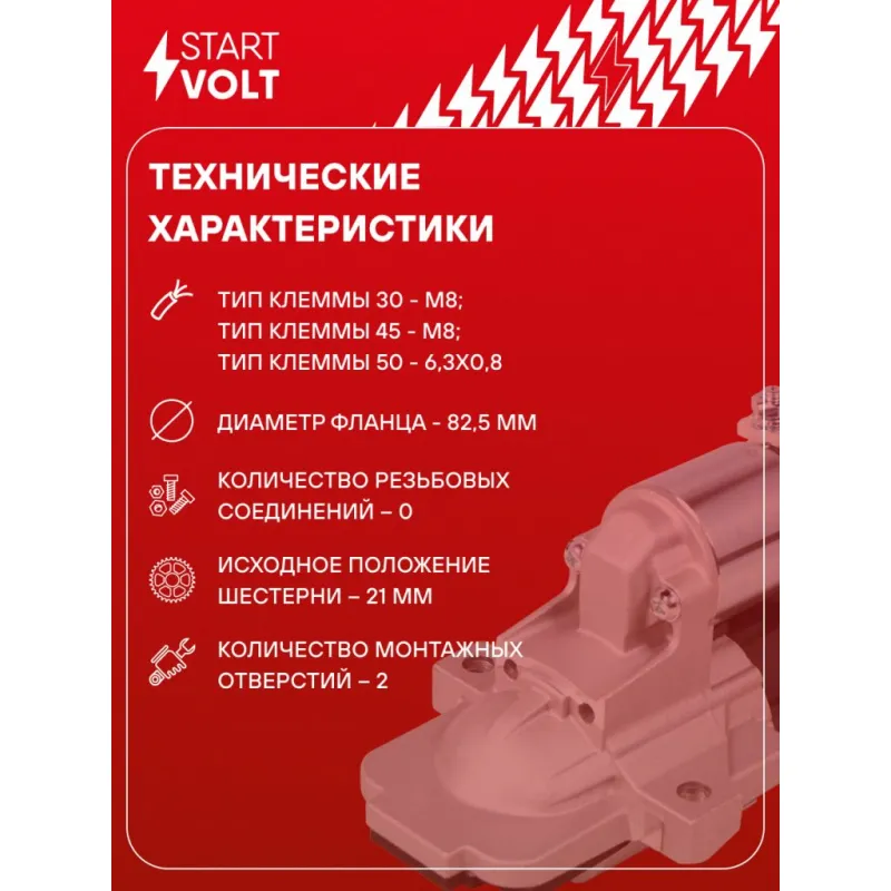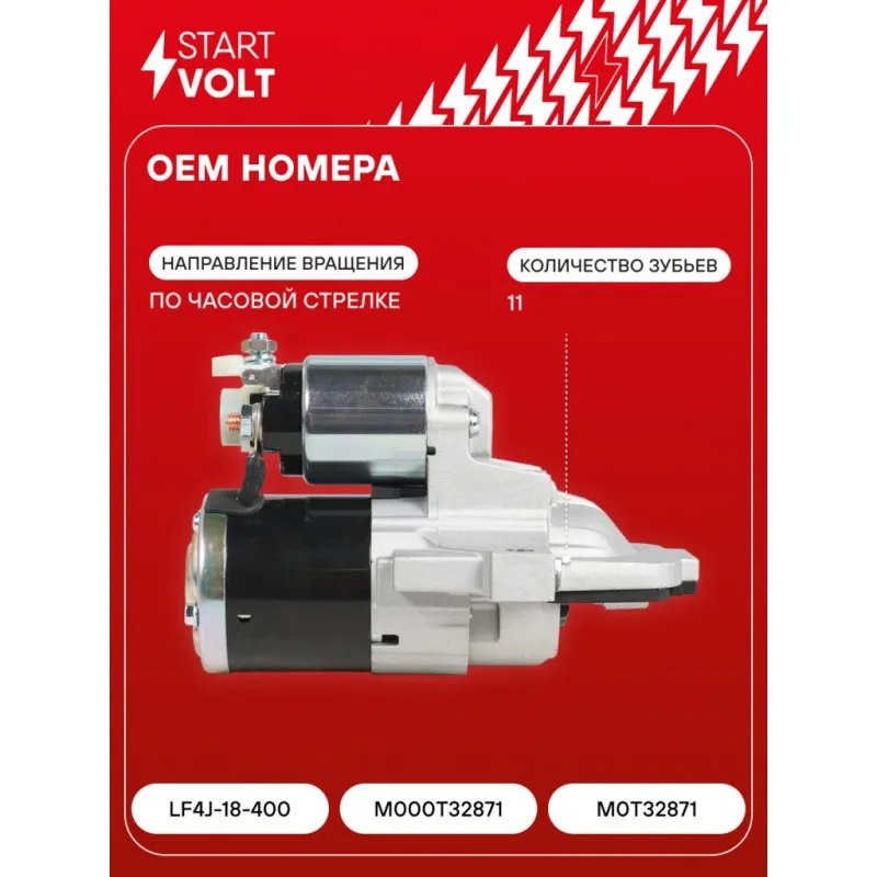 Стартер для автомобилей Mazda 6 GH (07-) 1.8i/2.0i 1,2кВт Описание: Оригинальный стартер STARTVOLT LSt 2510 мощностью 1,2 кВт предназначен для пуска автомобильного двигателя внутреннего сгорания. Предназначен для автомобилей MAZDA 3, 5, 6.. Подбор по VIN-номеру вашего автомобиля - через кнопку 'Задать вопрос'. Специалист проверит применяемость и ответит вам. Полностью повторяет параметры оригинальных изделий, обеспечивая надёжный запуск двигателя при любых условиях. Изготовлен с соблюдением оригинальных геометрических параметров, полностью совместим с заводскими узлами. Преимущества: • Полное соответствие оригинальным узлам; • Совместим с оригинальными деталями; • Длительный срок службы и устойчивость к износу; • Стабильная работа системы запуска; • Высокоточная сборка с пооперационным контролем качества; • Каждый стартер проходит стендовое тестирование — протокол в комплекте; • Надёжность при любом запуске двигателя; • STARTVOLT — 15 лет на рынке автоэлектрики — нам доверяют профессионалы; • Сертифицирован по стандарту EAC (ЕАЭС) — соответствует требованиям безопасности и качества. Товар новый, не восстановленный. Готов к установке. Отличный выбор для уверенного запуска двигателя в любых условиях. Характеристики: Артикул: LSt 2510 OEM номера: LF4J-18-400, M000T32871, M0T32871 Номинальное напряжение, В: 12 Количество зубьев: 11 Направление вращения: по часовой стрелке Мощность, кВт: 1,2 Тип клеммы 30: M8 Тип клеммы 45: M8 Тип клеммы 50: 6,3x0,8 Количество резьбовых соединений: 0 Диаметр фланца, мм: 82,5 Исходное положение шестерни, мм: 21 Количество монтажных отверстий: 2 Количество на автомобиль: 1 Комплектация: Индивидуальный технический паспорт - 1 шт Стартер - 1 шт Паспорт изделия/гарантийный талон - 1 шт Гарантия: от 1 года.