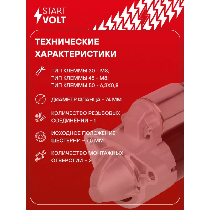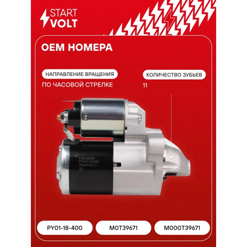 Стартер для автомобилей Mazda CX-5 (15-)/6 GJ (13-) 2.5i 1,2кВт Описание: Оригинальный стартер STARTVOLT LSt 2506 мощностью 1,2 кВт предназначен для пуска автомобильного двигателя внутреннего сгорания. Предназначен для автомобилей MAZDA 3, 6, CX-5.. Подбор по VIN-номеру вашего автомобиля - через кнопку 'Задать вопрос'. Специалист проверит применяемость и ответит вам. Полностью повторяет параметры оригинальных изделий, обеспечивая надёжный запуск двигателя при любых условиях. Изготовлен с соблюдением оригинальных геометрических параметров, полностью совместим с заводскими узлами. Преимущества: • Полное соответствие оригинальным узлам; • Совместим с оригинальными деталями; • Длительный срок службы и устойчивость к износу; • Стабильная работа системы запуска; • Высокоточная сборка с пооперационным контролем качества; • Каждый стартер проходит стендовое тестирование — протокол в комплекте; • Надёжность при любом запуске двигателя; • STARTVOLT — 15 лет на рынке автоэлектрики — нам доверяют профессионалы; • Сертифицирован по стандарту EAC (ЕАЭС) — соответствует требованиям безопасности и качества. Товар новый, не восстановленный. Готов к установке. Отличный выбор для уверенного запуска двигателя в любых условиях. Характеристики: Артикул: LSt 2506 OEM номера: PY01-18-400, M0T39671, M000T39671 Номинальное напряжение, В: 12 Количество зубьев: 11 Направление вращения: по часовой стрелке Мощность, кВт: 1,2 Тип клеммы 30: M8 Тип клеммы 45: M8 Тип клеммы 50: 6,3x0,8 Количество резьбовых соединений: 1 Диаметр фланца, мм: 74 Исходное положение шестерни, мм: 7,5 Сопутствующий товар: Втягивающие реле: VSR 2506 Сопутствующий товар: Щёточные узлы: VBS 2503 Сопутствующий товар: Приводы стартеров (бендиксы): VCS 2505 Количество монтажных отверстий: 2 Количество на автомобиль: 1 Комплектация: Индивидуальный технический паспорт - 1 шт Стартер - 1 шт Паспорт изделия/гарантийный талон - 1 шт Гарантия: от 1 года.