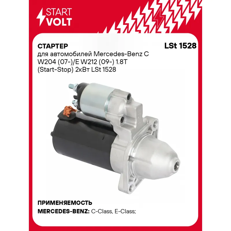 Стартер для автомобилей Mercedes-Benz C W204 (07-)/E W212 (09-) 1.8T (Start-Stop) 2кВт Описание: Оригинальный стартер STARTVOLT LSt 1528 мощностью 2 кВт предназначен для пуска автомобильного двигателя внутреннего сгорания. Предназначен для автомобилей MERCEDES-BENZ C-Class, E-Class, SLK.. Подбор по VIN-номеру вашего автомобиля - через кнопку 'Задать вопрос'. Специалист проверит применяемость и ответит вам. Полностью повторяет параметры оригинальных изделий, обеспечивая надёжный запуск двигателя при любых условиях. Изготовлен с соблюдением оригинальных геометрических параметров, полностью совместим с заводскими узлами. Преимущества: • Полное соответствие оригинальным узлам; • Совместим с оригинальными деталями; • Длительный срок службы и устойчивость к износу; • Стабильная работа системы запуска; • Высокоточная сборка с пооперационным контролем качества; • Каждый стартер проходит стендовое тестирование — протокол в комплекте; • Надёжность при любом запуске двигателя; • STARTVOLT — 15 лет на рынке автоэлектрики — нам доверяют профессионалы; • Сертифицирован по стандарту EAC (ЕАЭС) — соответствует требованиям безопасности и качества. Товар новый, не восстановленный. Готов к установке. Отличный выбор для уверенного запуска двигателя в любых условиях. Характеристики: Артикул: LSt 1528 OEM номера: A 271 906 02 00, A 271 906 02 00 0080, 271 906 02 00, 271 906 02 00 0080, 0001147408, 0001147409 Количество зубьев: 13 Направление вращения: по часовой стрелке Мощность, кВт: 2 Тип клеммы 30: M8 Тип клеммы 45: M8 Тип клеммы 50: M6 Количество резьбовых соединений: 2 Диаметр фланца, мм: 70 Исходное положение шестерни, мм: 29 Количество монтажных отверстий: 2 Количество на автомобиль: 1 Номинальное напряжение, В: 12 Комплектация: Индивидуальный технический паспорт - 1 шт Стартер - 1 шт Паспорт изделия/гарантийный талон - 1 шт Гарантия: от 1 года.