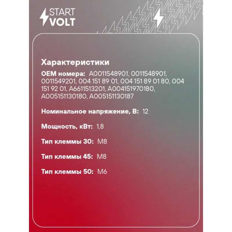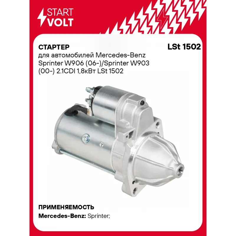 Стартер для автомобилей Mercedes-Benz Sprinter W906 (06-)/Sprinter W903 (00-) 2.1CDI 1,8кВт Описание: Оригинальный стартер STARTVOLT LSt 1502 мощностью 1,8 кВт предназначен для пуска автомобильного двигателя внутреннего сгорания. Предназначен для автомобилей MERCEDES-BENZ E-Class, G-Class, S-Class, SPRINTER, CLK, CLC, C-Class, V-Class, VARIO, VIANO, VITO.. Подбор по VIN-номеру вашего автомобиля - через кнопку 'Задать вопрос'. Специалист проверит применяемость и ответит вам. Полностью повторяет параметры оригинальных изделий, обеспечивая надёжный запуск двигателя при любых условиях. Изготовлен с соблюдением оригинальных геометрических параметров, полностью совместим с заводскими узлами. Преимущества: • Полное соответствие оригинальным узлам; • Совместим с оригинальными деталями; • Длительный срок службы и устойчивость к износу; • Стабильная работа системы запуска; • Высокоточная сборка с пооперационным контролем качества; • Каждый стартер проходит стендовое тестирование — протокол в комплекте; • Надёжность при любом запуске двигателя; • STARTVOLT — 15 лет на рынке автоэлектрики — нам доверяют профессионалы; • Сертифицирован по стандарту EAC (ЕАЭС) — соответствует требованиям безопасности и качества. Товар новый, не восстановленный. Готов к установке. Отличный выбор для уверенного запуска двигателя в любых условиях. Характеристики: Артикул: LSt 1502 OEM номера: A0011548901, 0011548901, 0011549201, 004 151 89 01, 004 151 89 01 80, 004 151 92 01, A6611513201, A004151970180, A005151130180, A005151130187, A0071518901, A0071519201, A661151350, A0011549201, A 004 151 89 01, A 004 151 89 01 80, A 004 151 92 01, A 004 151 92 01 80, A0041519701, 004 151 92 01 80, 0041519701, 005151130180, 0071518901, 0071519201, 6611513201, 432 644, D7R43 Номинальное напряжение, В: 12 Количество зубьев: 11 Направление вращения: по часовой стрелке Мощность, кВт: 1,8 Тип клеммы 30: M8 Тип клеммы 45: M8 Тип клеммы 50: M6 Количество резьбовых соединений: 2 Диаметр фланца, мм: 82,5 Исходное положение шестерни, мм: 26 Количество монтажных отверстий: 2 Количество на автомобиль: 1 Подходит для авто: Mercedes-Benz Sprinter (06-) Для проверки применяемости отправьте VIN автомобиля через вкладку "Есть вопросы о товаре?" Комплектация: Индивидуальный технический паспорт - 1 шт Стартер - 1 шт Паспорт изделия/гарантийный талон - 1 шт Гарантия: от 1 года.