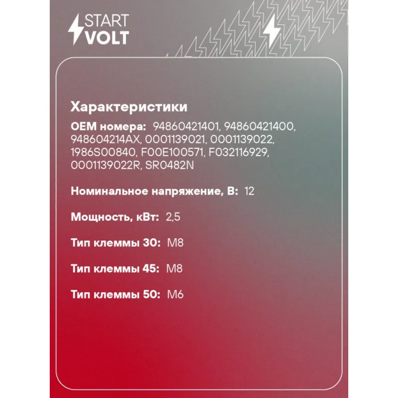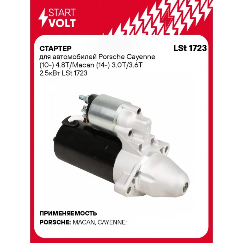 Стартер для автомобилей Porsche Cayenne (10-) 4.8T/Macan (14-) 3.0T/3.6T 2,5кВт Характеристики: Артикул: LSt 1723 OEM номера: 94860421401, 94860421400, 948604214AX, 0001139021, 0001139022, 1986S00840, F00E100571, F032116929, 0001139022R, SR0482N Номинальное напряжение, В: 12 Количество зубьев: 10 Направление вращения: по часовой стрелке Мощность, кВт: 2,5 Тип клеммы 30: M8 Тип клеммы 45: M8 Тип клеммы 50: M6 Количество резьбовых соединений: 0 Диаметр фланца, мм: 68 Исходное положение шестерни, мм: 29,5 Количество монтажных отверстий: 2 Количество на автомобиль: 1 Комплектация: Индивидуальный технический паспорт - 1 шт Стартер - 1 шт Паспорт изделия/гарантийный талон - 1 шт Гарантия: от 1 года.