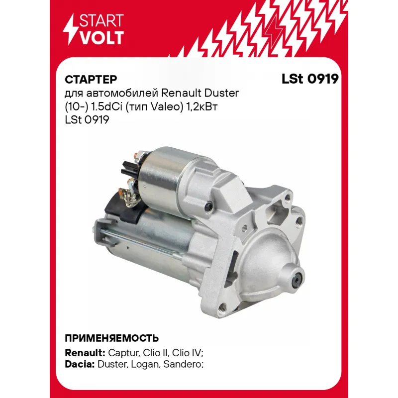 Стартер для автомобилей Renault Duster (10-) 1.5dCi (тип Valeo) 1,2кВт Описание: Оригинальный стартер STARTVOLT LSt 0919 мощностью 1,2 кВт предназначен для пуска автомобильного двигателя внутреннего сгорания. Предназначен для автомобилей DACIA DOKKER, DUSTER, LODGY, LOGAN, SANDERO, RENAULT MEGANE, TWINGO, TALISMAN, CLIO SYMBOL / THALIA, SCENIC, MODUS, LATITUDE, LAGUNA, KANGOO, KADJAR, FLUENCE, DUSTER, CLIO, CAPTUR.. Подбор по VIN-номеру вашего автомобиля - через кнопку 'Задать вопрос'. Специалист проверит применяемость и ответит вам. Полностью повторяет параметры оригинальных изделий, обеспечивая надёжный запуск двигателя при любых условиях. Изготовлен с соблюдением оригинальных геометрических параметров, полностью совместим с заводскими узлами. Преимущества: • Полное соответствие оригинальным узлам; • Совместим с оригинальными деталями; • Длительный срок службы и устойчивость к износу; • Стабильная работа системы запуска; • Высокоточная сборка с пооперационным контролем качества; • Каждый стартер проходит стендовое тестирование — протокол в комплекте; • Надёжность при любом запуске двигателя; • STARTVOLT — 15 лет на рынке автоэлектрики — нам доверяют профессионалы; • Сертифицирован по стандарту EAC (ЕАЭС) — соответствует требованиям безопасности и качества. Товар новый, не восстановленный. Готов к установке. Отличный выбор для уверенного запуска двигателя в любых условиях. Характеристики: Артикул: LSt 0919 OEM номера: 7711135334, 7711497567, 82 00 836 473, 233000603R, 23 30 033 29R, 438224, TS12E9, 438371, 446539, 458388, 458643, TS12M9 Номинальное напряжение, В: 12 Количество зубьев: 10 Направление вращения: по часовой стрелке Мощность, кВт: 1,2 Тип клеммы 30: M8 Тип клеммы 45: M8 Тип клеммы 50: M5 Количество резьбовых соединений: 3 Диаметр фланца, мм: 63 Исходное положение шестерни, мм: 0 Количество монтажных отверстий: 3 Количество на автомобиль: 1 Подходит для авто: Renault Captur (13-), Clio II (98-), Clio IV (12-), Fluence (10-), Kangoo (97-), Laguna III (07-), Scenic II (04-), Scenic III (09-), Twingo (07-), Duster (10-), Clio III (05-), Kangoo II (07-), Megane II (02-), Megane III (08-), Megane Scenic II (03-), Megane Scenic III (08-) Dacia Duster (10-), Logan (04-), Sandero (08-) Для проверки применяемости отправьте VIN автомобиля через вкладку "Есть вопросы о товаре?" Комплектация: Индивидуальный технический паспорт - 1 шт Стартер - 1 шт Паспорт изделия/гарантийный талон - 1 шт Гарантия: от 1 года.