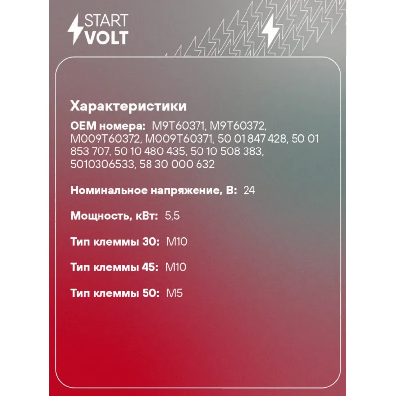 Стартер для автомобилей Renault Trucks Premium (96-) с дв. MIDR 24В 5,5кВт Описание: Оригинальный стартер STARTVOLT LSt 0996 мощностью 5,5 кВт предназначен для пуска автомобильного двигателя внутреннего сгорания. Предназначен для автомобилей RENAULT TRUCKS Premium, KERAX.. Подбор по VIN-номеру вашего автомобиля - через кнопку 'Задать вопрос'. Специалист проверит применяемость и ответит вам. Полностью повторяет параметры оригинальных изделий, обеспечивая надёжный запуск двигателя при любых условиях. Изготовлен с соблюдением оригинальных геометрических параметров, полностью совместим с заводскими узлами. Преимущества: • Полное соответствие оригинальным узлам; • Совместим с оригинальными деталями; • Длительный срок службы и устойчивость к износу; • Стабильная работа системы запуска; • Высокоточная сборка с пооперационным контролем качества; • Каждый стартер проходит стендовое тестирование — протокол в комплекте; • Надёжность при любом запуске двигателя; • STARTVOLT — 15 лет на рынке автоэлектрики — нам доверяют профессионалы; • Сертифицирован по стандарту EAC (ЕАЭС) — соответствует требованиям безопасности и качества. Товар новый, не восстановленный. Готов к установке. Отличный выбор для уверенного запуска двигателя в любых условиях. Характеристики: Артикул: LSt 0996 OEM номера: M9T60371, M9T60372, M009T60372, M009T60371, 50 01 847 428, 50 01 853 707, 50 10 480 435, 50 10 508 383, 5010306533, 58 30 000 632 Номинальное напряжение, В: 24 Количество зубьев: 12 Направление вращения: по часовой стрелке Мощность, кВт: 5,5 Тип клеммы 30: M10 Тип клеммы 45: M10 Тип клеммы 50: M5 Количество резьбовых соединений: 0 Диаметр фланца, мм: 89 Исходное положение шестерни, мм: 41 Количество монтажных отверстий: 3 Количество на автомобиль: 1 Комплектация: Индивидуальный технический паспорт - 1 шт Стартер - 1 шт Паспорт изделия/гарантийный талон - 1 шт Гарантия: от 1 года.