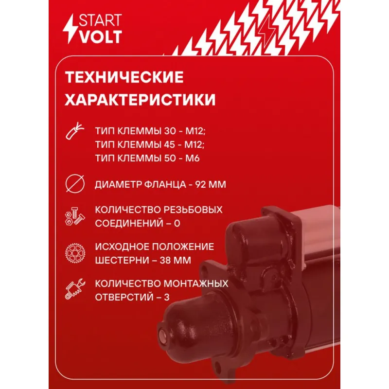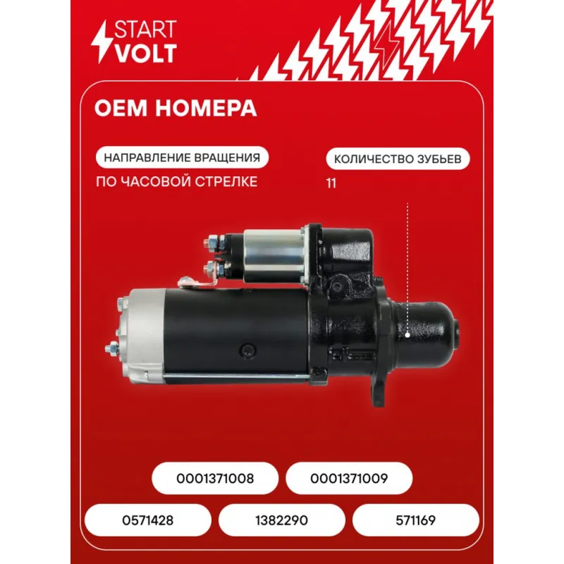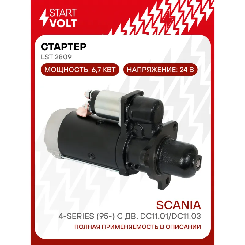 Стартер для автомобилей Scania 4-series (95-) с дв. DC11.01/DC11.03 24В 6,7кВт Описание: Оригинальный стартер STARTVOLT LSt 2809 мощностью 6,7 кВт предназначен для пуска автомобильного двигателя внутреннего сгорания. Предназначен для автомобилей SCANIA 4-SERIES.. Подбор по VIN-номеру вашего автомобиля - через кнопку 'Задать вопрос'. Специалист проверит применяемость и ответит вам. Полностью повторяет параметры оригинальных изделий, обеспечивая надёжный запуск двигателя при любых условиях. Изготовлен с соблюдением оригинальных геометрических параметров, полностью совместим с заводскими узлами. Преимущества: • Полное соответствие оригинальным узлам; • Совместим с оригинальными деталями; • Длительный срок службы и устойчивость к износу; • Стабильная работа системы запуска; • Высокоточная сборка с пооперационным контролем качества; • Каждый стартер проходит стендовое тестирование — протокол в комплекте; • Надёжность при любом запуске двигателя; • STARTVOLT — 15 лет на рынке автоэлектрики — нам доверяют профессионалы; • Сертифицирован по стандарту EAC (ЕАЭС) — соответствует требованиям безопасности и качества. Товар новый, не восстановленный. Готов к установке. Отличный выбор для уверенного запуска двигателя в любых условиях. Характеристики: Артикул: LSt 2809 OEM номера: 0571428, 1382290, 571169, 571428, 0001371008, 0001371009 Номинальное напряжение, В: 24 Количество зубьев: 11 Направление вращения: по часовой стрелке Мощность, кВт: 6,7 Тип клеммы 30: M12 Тип клеммы 45: M12 Тип клеммы 50: M6 Количество резьбовых соединений: 0 Диаметр фланца, мм: 92 Исходное положение шестерни, мм: 38 Количество монтажных отверстий: 3 Количество на автомобиль: 1 Комплектация: Индивидуальный технический паспорт - 1 шт Стартер - 1 шт Паспорт изделия/гарантийный талон - 1 шт Гарантия: от 1 года.