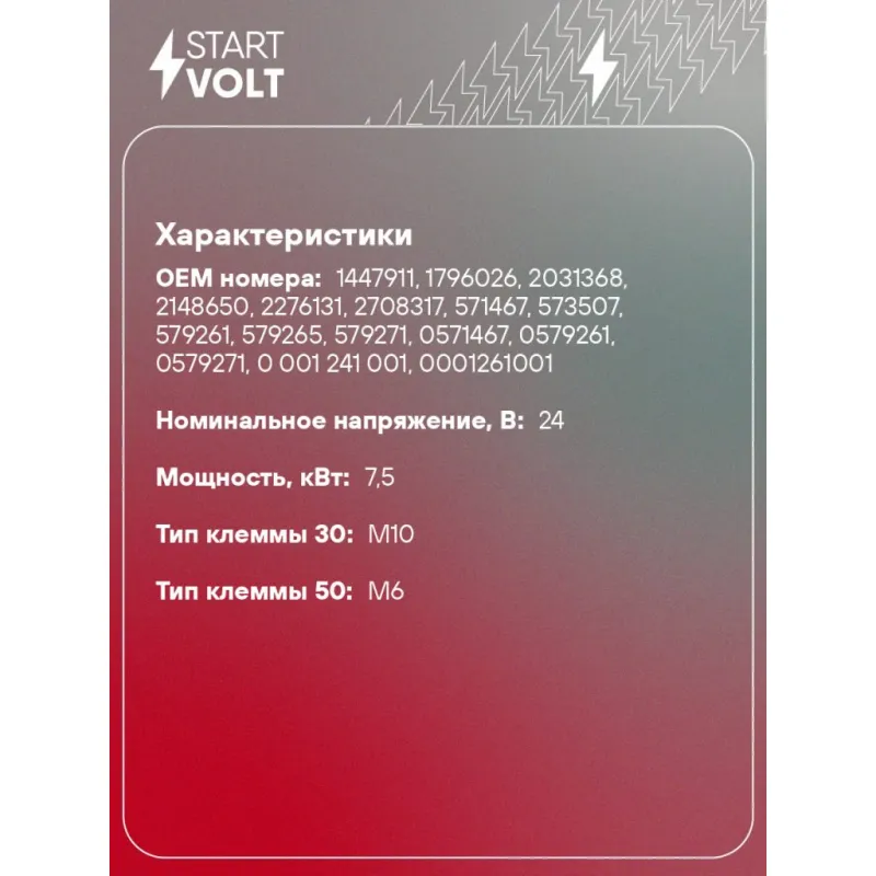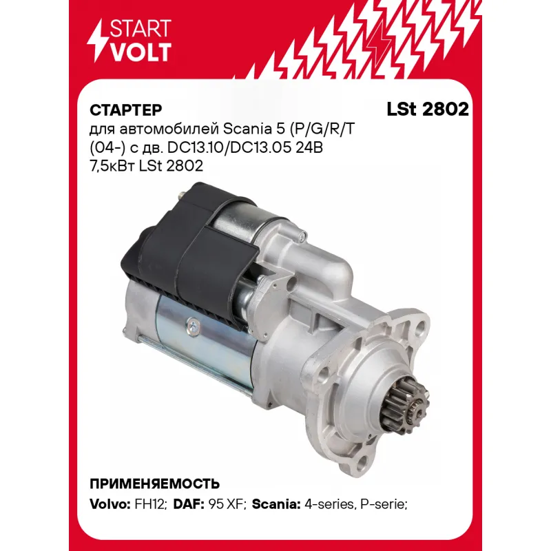 Стартер для автомобилей Scania 5 (P/G/R/T (04-) с дв. DC13.10/DС13.05 24В 7,5кВт Описание: Оригинальный стартер STARTVOLT LSt 2802 мощностью 7,5 кВт предназначен для пуска автомобильного двигателя внутреннего сгорания. Предназначен для автомобилей DAF 95, XF 95, MAN TGS, TGX, TGA, M2000, L2000, MERCEDES-BENZ LK/LN2, MK, CITARO, CITO, ATEGO, UNIMOG, AXOR, CONECTO, SK, NG, ACTROS, TOURO, INTEGRO, INTOURO, TOURINO, RENAULT TRUCKS Premium, SCANIA 4-SERIES, P,G,R,T-SERIES, P-SERIES, R-SERIES, G-SERIES, T-SERIES, 2-SERIES, K-SERIES, 3-SERIES, TOURING, CITYWIDE, OMNIEXPRESS, S-SERIES, OMNICITY, OMNILINK, K-SERIES BUS, N-SERIES, F-SERIES, 4-SERIES BUS, L-SERIES, VOLVO 9700, NH, FH, FM, FL.. Подбор по VIN-номеру вашего автомобиля - через кнопку 'Задать вопрос'. Специалист проверит применяемость и ответит вам. Полностью повторяет параметры оригинальных изделий, обеспечивая надёжный запуск двигателя при любых условиях. Изготовлен с соблюдением оригинальных геометрических параметров, полностью совместим с заводскими узлами. Преимущества: • Полное соответствие оригинальным узлам; • Совместим с оригинальными деталями; • Длительный срок службы и устойчивость к износу; • Стабильная работа системы запуска; • Высокоточная сборка с пооперационным контролем качества; • Каждый стартер проходит стендовое тестирование — протокол в комплекте; • Надёжность при любом запуске двигателя; • STARTVOLT — 15 лет на рынке автоэлектрики — нам доверяют профессионалы; • Сертифицирован по стандарту EAC (ЕАЭС) — соответствует требованиям безопасности и качества. Товар новый, не восстановленный. Готов к установке. Отличный выбор для уверенного запуска двигателя в любых условиях. Характеристики: Артикул: LSt 2802 OEM номера: 1447911, 1796026, 2031368, 2148650, 2276131, 2708317, 571467, 573507, 579261, 579265, 579271, 0571467, 0579261, 0579271, 0 001 241 001, 0001261001, 0001261002, 0001261025, 0001261026, 0001261027, 0001261028 Номинальное напряжение, В: 24 Количество зубьев: 12 Направление вращения: по часовой стрелке Мощность, кВт: 7,5 Тип клеммы 30: M10 Тип клеммы 50: M6 Количество резьбовых соединений: 0 Диаметр фланца, мм: 92 Исходное положение шестерни, мм: 48,8 Количество монтажных отверстий: 3 Количество на автомобиль: 1 Подходит для авто: Volvo FH12 (93-) DAF 95 XF (97-) Scania 4-series (95-), P-serie (04-) Для проверки применяемости отправьте VIN автомобиля через вкладку "Есть вопросы о товаре?" Комплектация: Индивидуальный технический паспорт - 1 шт Стартер - 1 шт Паспорт изделия/гарантийный талон - 1 шт Гарантия: от 1 года.