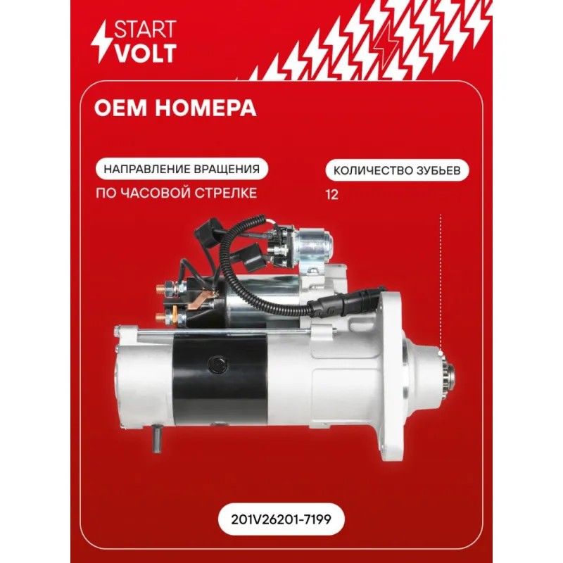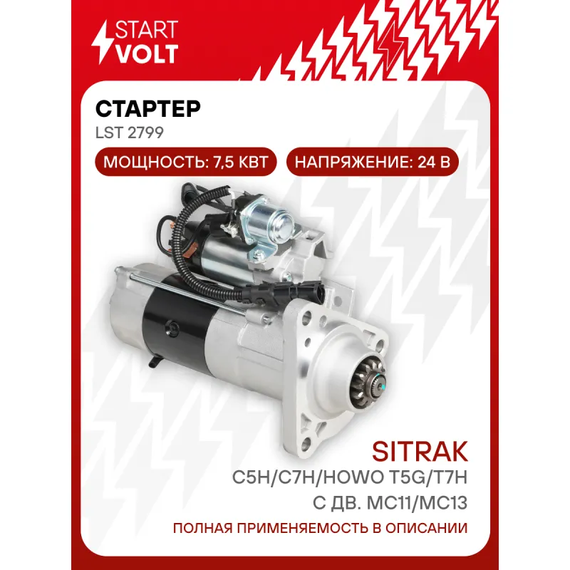 Стартер для автомобилей Sitrak C5H/C7H/HOWO T5G/T7H с дв. MC11/MC13 24В 7,5кВт Описание: Оригинальный стартер STARTVOLT LSt 2799 мощностью 7,5 кВт предназначен для пуска автомобильного двигателя внутреннего сгорания. Предназначен для автомобилей . Подбор по VIN-номеру вашего автомобиля - через кнопку 'Задать вопрос'. Специалист проверит применяемость и ответит вам. Полностью повторяет параметры оригинальных изделий, обеспечивая надёжный запуск двигателя при любых условиях. Изготовлен с соблюдением оригинальных геометрических параметров, полностью совместим с заводскими узлами. Преимущества: • Полное соответствие оригинальным узлам; • Совместим с оригинальными деталями; • Длительный срок службы и устойчивость к износу; • Стабильная работа системы запуска; • Высокоточная сборка с пооперационным контролем качества; • Каждый стартер проходит стендовое тестирование — протокол в комплекте; • Надёжность при любом запуске двигателя; • STARTVOLT — 15 лет на рынке автоэлектрики — нам доверяют профессионалы; • Сертифицирован по стандарту EAC (ЕАЭС) — соответствует требованиям безопасности и качества. Товар новый, не восстановленный. Готов к установке. Отличный выбор для уверенного запуска двигателя в любых условиях. Характеристики: Артикул: LSt 2799 OEM номера: 201V26201-7199 Номинальное напряжение, В: 24 Количество зубьев: 12 Направление вращения: по часовой стрелке Мощность, кВт: 7,5 Тип клеммы 30: M10 Тип клеммы 45: M10 Тип клеммы 50: M5 Количество резьбовых соединений: 0 Диаметр фланца, мм: 92 Исходное положение шестерни, мм: 47,5 Количество монтажных отверстий: 3 Количество на автомобиль: 1 Комплектация: Индивидуальный технический паспорт - 1 шт Стартер - 1 шт Паспорт изделия/гарантийный талон - 1 шт Гарантия: от 1 года.
