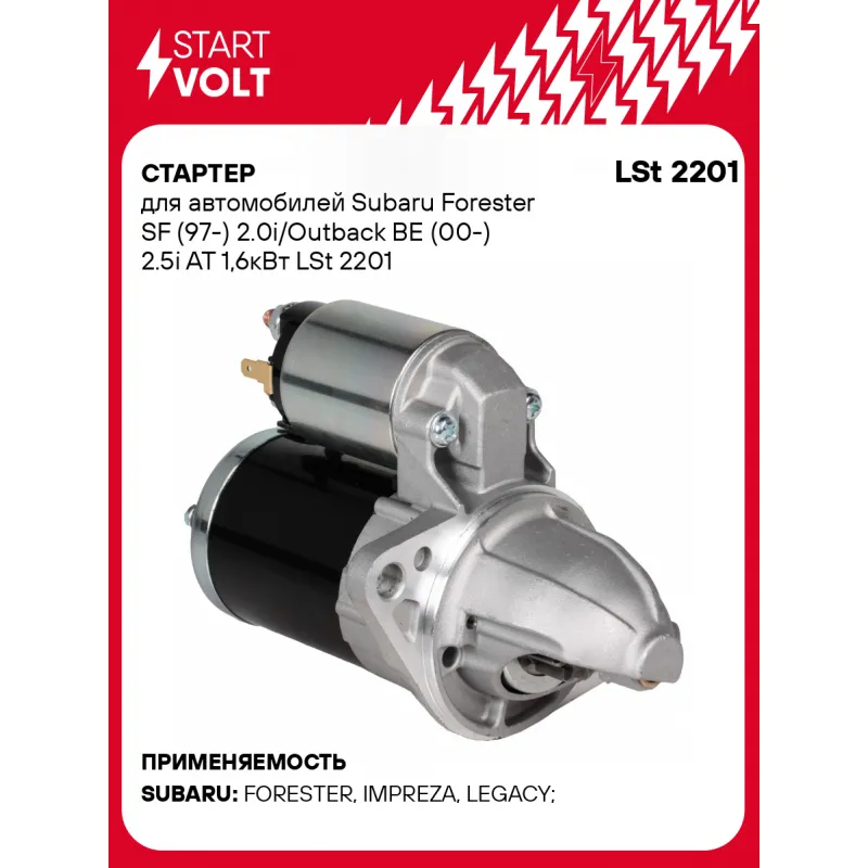 Стартер для автомобилей Subaru Forester SF (97-) 2.0i/Outback BE (00-) 2.5i AT 1,6кВт Описание: Оригинальный стартер STARTVOLT LSt 2201 мощностью 1,6 кВт предназначен для пуска автомобильного двигателя внутреннего сгорания. Предназначен для автомобилей SUBARU FORESTER, IMPREZA, LEGACY, OUTBACK, LEONE, SVX.. Подбор по VIN-номеру вашего автомобиля - через кнопку 'Задать вопрос'. Специалист проверит применяемость и ответит вам. Полностью повторяет параметры оригинальных изделий, обеспечивая надёжный запуск двигателя при любых условиях. Изготовлен с соблюдением оригинальных геометрических параметров, полностью совместим с заводскими узлами. Преимущества: • Полное соответствие оригинальным узлам; • Совместим с оригинальными деталями; • Длительный срок службы и устойчивость к износу; • Стабильная работа системы запуска; • Высокоточная сборка с пооперационным контролем качества; • Каждый стартер проходит стендовое тестирование — протокол в комплекте; • Надёжность при любом запуске двигателя; • STARTVOLT — 15 лет на рынке автоэлектрики — нам доверяют профессионалы; • Сертифицирован по стандарту EAC (ЕАЭС) — соответствует требованиям безопасности и качества. Товар новый, не восстановленный. Готов к установке. Отличный выбор для уверенного запуска двигателя в любых условиях. Характеристики: Артикул: LSt 2201 OEM номера: 23300-AA460, 23300-AA300, 23300-AA020, 23300-AA050, 23300-AA190, 23300-AA210, 23300-AA390, 23300-AA570, 42991-7300, 42991-7310, 42991-7500, M001T75681, M001T84481, M001T86481, M0T20171, M0T20175, M1T74081, M1T74087, M1T75681, M1T84481, M1T86481, 23300-AA572, 23300-AA573 Номинальное напряжение, В: 12 Количество зубьев: 9 Направление вращения: против часовой стрелки Мощность, кВт: 1,6 Тип клеммы 30: M8 Тип клеммы 45: M8 Тип клеммы 50: 6,3x0,8 Количество резьбовых соединений: 0 Диаметр фланца, мм: 82,5 Исходное положение шестерни, мм: 33 Сопутствующий товар: Втягивающие реле: VSR 2501 Сопутствующий товар: Щёточные узлы: VBS 2503 Сопутствующий товар: Приводы стартеров (бендиксы): VCS 2201 Количество монтажных отверстий: 2 Количество на автомобиль: 1 Комплектация: Индивидуальный технический паспорт - 1 шт Стартер - 1 шт Паспорт изделия/гарантийный талон - 1 шт Гарантия: от 1 года.