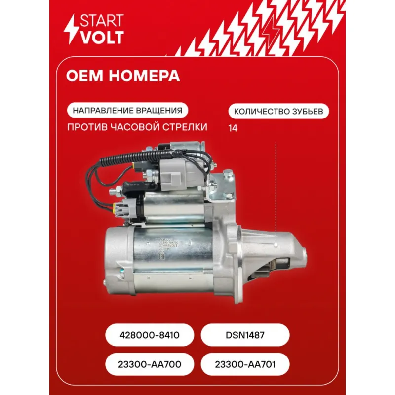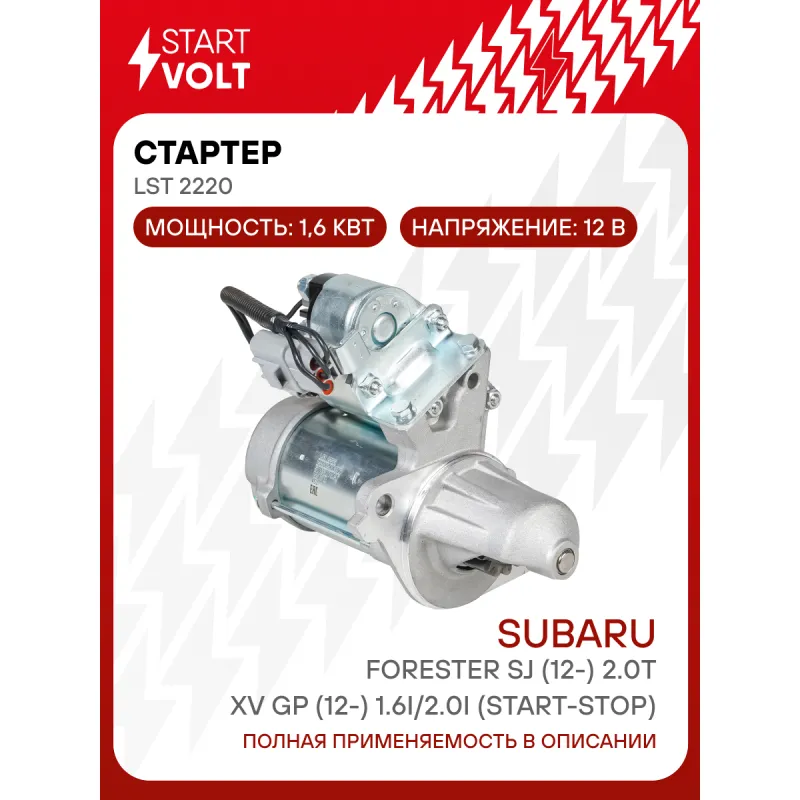 Стартер для автомобилей Subaru Forester SJ (12-) 2.0T/XV GP (12-) 1.6i/2.0i (Start-Stop) 1,6кВт Описание: Оригинальный стартер STARTVOLT LSt 2220 мощностью 1,6 кВт предназначен для пуска автомобильного двигателя внутреннего сгорания. Предназначен для автомобилей SUBARU FORESTER, XV, IMPREZA.. Подбор по VIN-номеру вашего автомобиля - через кнопку 'Задать вопрос'. Специалист проверит применяемость и ответит вам. Полностью повторяет параметры оригинальных изделий, обеспечивая надёжный запуск двигателя при любых условиях. Изготовлен с соблюдением оригинальных геометрических параметров, полностью совместим с заводскими узлами. Преимущества: • Полное соответствие оригинальным узлам; • Совместим с оригинальными деталями; • Длительный срок службы и устойчивость к износу; • Стабильная работа системы запуска; • Высокоточная сборка с пооперационным контролем качества; • Каждый стартер проходит стендовое тестирование — протокол в комплекте; • Надёжность при любом запуске двигателя; • STARTVOLT — 15 лет на рынке автоэлектрики — нам доверяют профессионалы; • Сертифицирован по стандарту EAC (ЕАЭС) — соответствует требованиям безопасности и качества. Товар новый, не восстановленный. Готов к установке. Отличный выбор для уверенного запуска двигателя в любых условиях. Характеристики: Артикул: LSt 2220 OEM номера: 23300-AA700, 23300-AA701, 428000-8410, DSN1487 Номинальное напряжение, В: 12 Количество зубьев: 14 Направление вращения: против часовой стрелки Мощность, кВт: 1,6 Тип клеммы 30: M8 Тип клеммы 45: M8 Тип клеммы 50: 2 pin Количество резьбовых соединений: 0 Диаметр фланца, мм: 82,5 Исходное положение шестерни, мм: 32,5 Количество монтажных отверстий: 2 Количество на автомобиль: 1 Подходит для авто: Subaru XV (11-), Forester SJ (12-) Для проверки применяемости отправьте VIN автомобиля через вкладку "Есть вопросы о товаре?" Комплектация: Индивидуальный технический паспорт - 1 шт Стартер - 1 шт Паспорт изделия/гарантийный талон - 1 шт Гарантия: от 1 года.