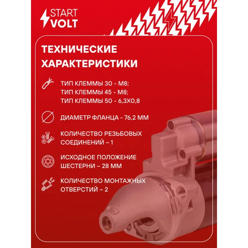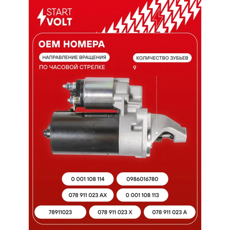 Стартер для автомобилей VAG 100 (90-) 2.6i/2.8i/A6 (94-) 2.6i 1,4кВт Описание: Оригинальный стартер STARTVOLT LSt 1859 мощностью 1,4 кВт предназначен для пуска автомобильного двигателя внутреннего сгорания. Предназначен для автомобилей AUDI A4, COUPE, A3, 100, 80, A6, A8, CABRIOLET, VW PASSAT.. Подбор по VIN-номеру вашего автомобиля - через кнопку 'Задать вопрос'. Специалист проверит применяемость и ответит вам. Полностью повторяет параметры оригинальных изделий, обеспечивая надёжный запуск двигателя при любых условиях. Изготовлен с соблюдением оригинальных геометрических параметров, полностью совместим с заводскими узлами. Преимущества: • Полное соответствие оригинальным узлам; • Совместим с оригинальными деталями; • Длительный срок службы и устойчивость к износу; • Стабильная работа системы запуска; • Высокоточная сборка с пооперационным контролем качества; • Каждый стартер проходит стендовое тестирование — протокол в комплекте; • Надёжность при любом запуске двигателя; • STARTVOLT — 15 лет на рынке автоэлектрики — нам доверяют профессионалы; • Сертифицирован по стандарту EAC (ЕАЭС) — соответствует требованиям безопасности и качества. Товар новый, не восстановленный. Готов к установке. Отличный выбор для уверенного запуска двигателя в любых условиях. Характеристики: Артикул: LSt 1859 OEM номера: 078 911 023, 078 911 023 X, 078 911 023 A, 078 911 023 AX, 0 001 108 113, 0 001 108 114, 0986016780 Номинальное напряжение, В: 12 Количество зубьев: 9 Направление вращения: по часовой стрелке Мощность, кВт: 1,4 Тип клеммы 30: M8 Тип клеммы 45: M8 Тип клеммы 50: 6,3x0,8 Количество резьбовых соединений: 1 Диаметр фланца, мм: 76,2 Исходное положение шестерни, мм: 28 Количество монтажных отверстий: 2 Количество на автомобиль: 1 Подходит для авто: Audi 100 (90-), 80 (91-), A3 (12-), A4 B5 (94-), A6 C4 (94-), A8 (94-), Cabriolet (92-), Coupe (91-), Coupe (91-) Volkswagen Passat B5 (96-) Для проверки применяемости отправьте VIN автомобиля через вкладку "Есть вопросы о товаре?" Комплектация: Стартер - 1 шт Индивидуальный технический паспорт - 1 шт Паспорт изделия/гарантийный талон - 1 шт Гарантия: от 1 года.