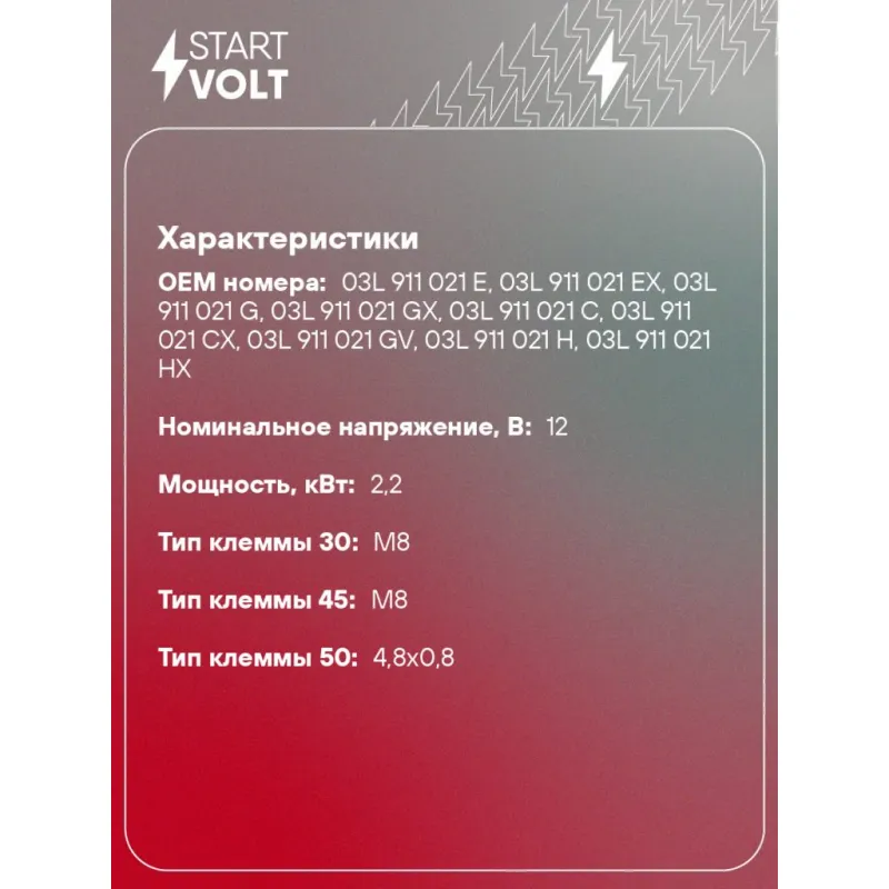 Стартер для автомобилей VAG A4 (07-)/Q5 (08-) 2.0TDI (Start-Stop) 2,2кВт Описание: Оригинальный стартер STARTVOLT LSt 1865 мощностью 2,2 кВт предназначен для пуска автомобильного двигателя внутреннего сгорания. Предназначен для автомобилей AUDI A6, A4, A5, Q5.. Подбор по VIN-номеру вашего автомобиля - через кнопку 'Задать вопрос'. Специалист проверит применяемость и ответит вам. Полностью повторяет параметры оригинальных изделий, обеспечивая надёжный запуск двигателя при любых условиях. Изготовлен с соблюдением оригинальных геометрических параметров, полностью совместим с заводскими узлами. Преимущества: • Полное соответствие оригинальным узлам; • Совместим с оригинальными деталями; • Длительный срок службы и устойчивость к износу; • Стабильная работа системы запуска; • Высокоточная сборка с пооперационным контролем качества; • Каждый стартер проходит стендовое тестирование — протокол в комплекте; • Надёжность при любом запуске двигателя; • STARTVOLT — 15 лет на рынке автоэлектрики — нам доверяют профессионалы; • Сертифицирован по стандарту EAC (ЕАЭС) — соответствует требованиям безопасности и качества. Товар новый, не восстановленный. Готов к установке. Отличный выбор для уверенного запуска двигателя в любых условиях. Характеристики: Артикул: LSt 1865 OEM номера: 03L 911 021 E, 03L 911 021 EX, 03L 911 021 G, 03L 911 021 GX, 03L 911 021 C, 03L 911 021 CX, 03L 911 021 GV, 03L 911 021 H, 03L 911 021 HX, 03L 911 021 X, 03L 911 024 BX, 03L 911 021, 0 001 139 075, 0 001 139 076, 0001115056, 0001115057, 0001115082, 0001115083, 0 001 115 110, 0 001 115 111, 0001139019, 0001139020, 0986024030, 0986024040 Номинальное напряжение, В: 12 Количество зубьев: 10 Направление вращения: по часовой стрелке Мощность, кВт: 2,2 Тип клеммы 30: M8 Тип клеммы 45: M8 Тип клеммы 50: 4,8x0,8 Количество резьбовых соединений: 1 Диаметр фланца, мм: 66 Исходное положение шестерни, мм: 23,5 Количество монтажных отверстий: 2 Количество на автомобиль: 1 Подходит для авто: Audi A4 B8 (07-), A5 (07-), A6 C7 (11-), Q5 (08-) Для проверки применяемости отправьте VIN автомобиля через вкладку "Есть вопросы о товаре?" Комплектация: Индивидуальный технический паспорт - 1 шт Стартер - 1 шт Паспорт изделия/гарантийный талон - 1 шт Гарантия: от 1 года.