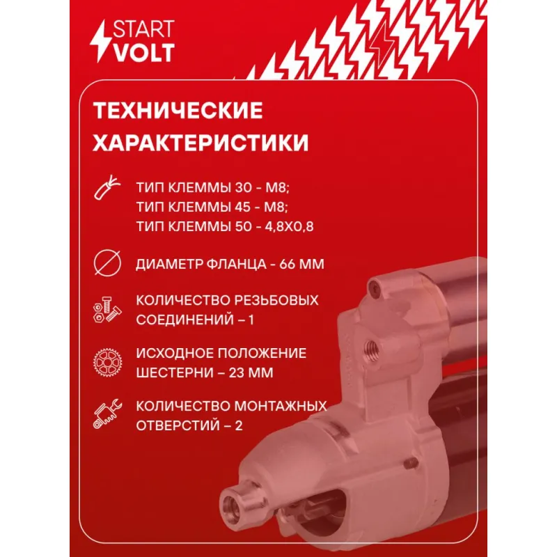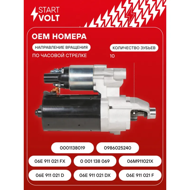 Стартер для автомобилей VAG Cayenne (17-) 3.0TFSI/A6 (10-) 2.8TFSI/3.0TFSI (Start-Stop) 1,7кВт Описание: Оригинальный стартер STARTVOLT LSt 1861 мощностью 1,7 кВт предназначен для пуска автомобильного двигателя внутреннего сгорания. Предназначен для автомобилей AUDI Q5, A8, A7, A6, A5, A4, PORSCHE CAYENNE.. Подбор по VIN-номеру вашего автомобиля - через кнопку 'Задать вопрос'. Специалист проверит применяемость и ответит вам. Полностью повторяет параметры оригинальных изделий, обеспечивая надёжный запуск двигателя при любых условиях. Изготовлен с соблюдением оригинальных геометрических параметров, полностью совместим с заводскими узлами. Преимущества: • Полное соответствие оригинальным узлам; • Совместим с оригинальными деталями; • Длительный срок службы и устойчивость к износу; • Стабильная работа системы запуска; • Высокоточная сборка с пооперационным контролем качества; • Каждый стартер проходит стендовое тестирование — протокол в комплекте; • Надёжность при любом запуске двигателя; • STARTVOLT — 15 лет на рынке автоэлектрики — нам доверяют профессионалы; • Сертифицирован по стандарту EAC (ЕАЭС) — соответствует требованиям безопасности и качества. Товар новый, не восстановленный. Готов к установке. Отличный выбор для уверенного запуска двигателя в любых условиях. Характеристики: Артикул: LSt 1861 OEM номера: 06E 911 021 D, 06E 911 021 DX, 06E 911 021 F, 06E 911 021 FX, 0 001 138 069, 06M911021X, 0001138019, 0986025240 Номинальное напряжение, В: 12 Количество зубьев: 10 Направление вращения: по часовой стрелке Мощность, кВт: 1,7 Тип клеммы 30: M8 Тип клеммы 45: M8 Тип клеммы 50: 4,8x0,8 Количество резьбовых соединений: 1 Диаметр фланца, мм: 66 Исходное положение шестерни, мм: 23 Количество монтажных отверстий: 2 Количество на автомобиль: 1 Подходит для авто: Audi A4 B8 (07-), A5 (07-), A6 C7 (11-), A8 (10-), Q5 (08-), A7 (10-) Для проверки применяемости отправьте VIN автомобиля через вкладку "Есть вопросы о товаре?" Комплектация: Индивидуальный технический паспорт - 1 шт Стартер - 1 шт Паспорт изделия/гарантийный талон - 1 шт Гарантия: от 1 года.