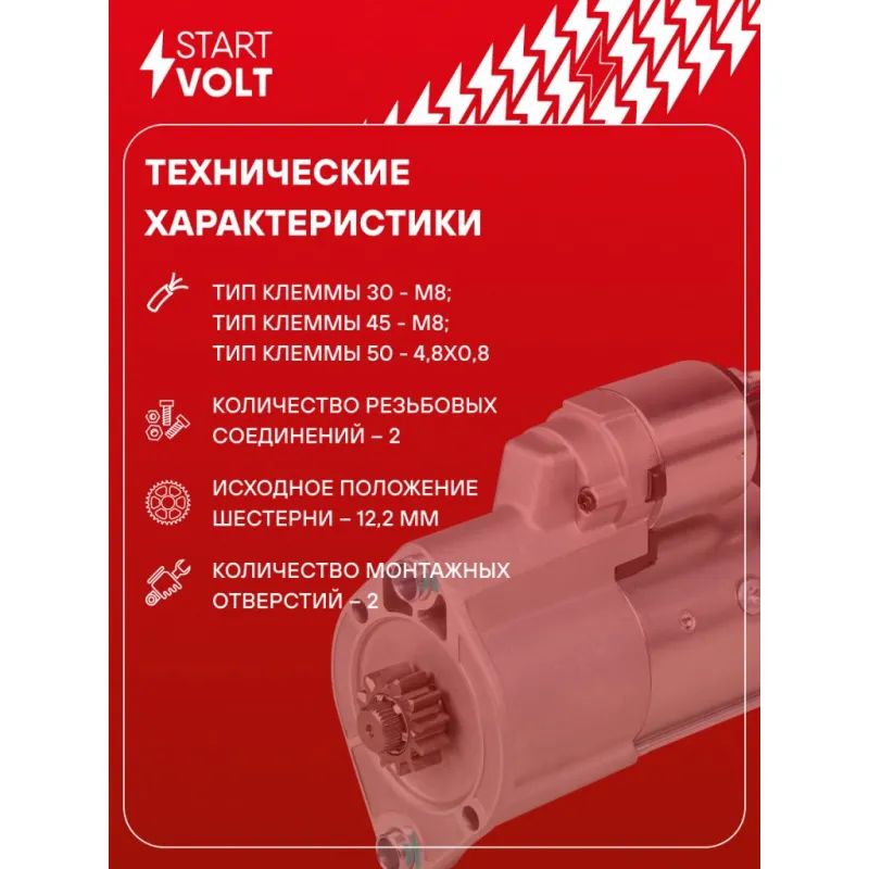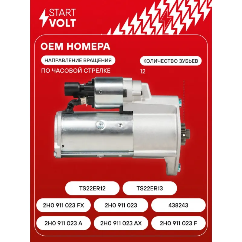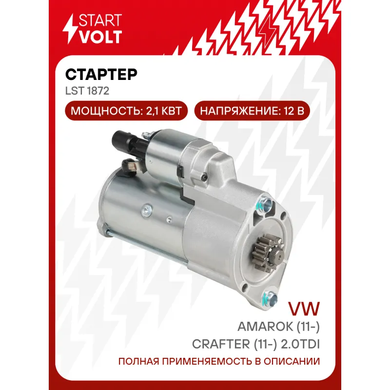 Стартер для автомобилей VAG Amarok (11-)/Crafter (11-) 2.0TDI MT 2,1кВт Описание: Оригинальный стартер STARTVOLT LSt 1872 мощностью 2,1 кВт предназначен для пуска автомобильного двигателя внутреннего сгорания. Предназначен для автомобилей VW AMAROK, CRAFTER.. Подбор по VIN-номеру вашего автомобиля - через кнопку 'Задать вопрос'. Специалист проверит применяемость и ответит вам. Полностью повторяет параметры оригинальных изделий, обеспечивая надёжный запуск двигателя при любых условиях. Изготовлен с соблюдением оригинальных геометрических параметров, полностью совместим с заводскими узлами. Преимущества: • Полное соответствие оригинальным узлам; • Совместим с оригинальными деталями; • Длительный срок службы и устойчивость к износу; • Стабильная работа системы запуска; • Высокоточная сборка с пооперационным контролем качества; • Каждый стартер проходит стендовое тестирование — протокол в комплекте; • Надёжность при любом запуске двигателя; • STARTVOLT — 15 лет на рынке автоэлектрики — нам доверяют профессионалы; • Сертифицирован по стандарту EAC (ЕАЭС) — соответствует требованиям безопасности и качества. Товар новый, не восстановленный. Готов к установке. Отличный выбор для уверенного запуска двигателя в любых условиях. Характеристики: Артикул: LSt 1872 OEM номера: 2H0 911 023 A, 2H0 911 023 AX, 2H0 911 023 F, 2H0 911 023 FX, 2H0 911 023, 438243, TS22ER12, TS22ER13 Количество зубьев: 12 Направление вращения: по часовой стрелке Мощность, кВт: 2,1 Тип клеммы 30: M8 Тип клеммы 45: M8 Тип клеммы 50: 4,8x0,8 Количество резьбовых соединений: 2 Исходное положение шестерни, мм: 12,2 Количество монтажных отверстий: 2 Количество на автомобиль: 1 Номинальное напряжение, В: 12 Комплектация: Индивидуальный технический паспорт - 1 шт Стартер - 1 шт Паспорт изделия/гарантийный талон - 1 шт Гарантия: от 1 года.